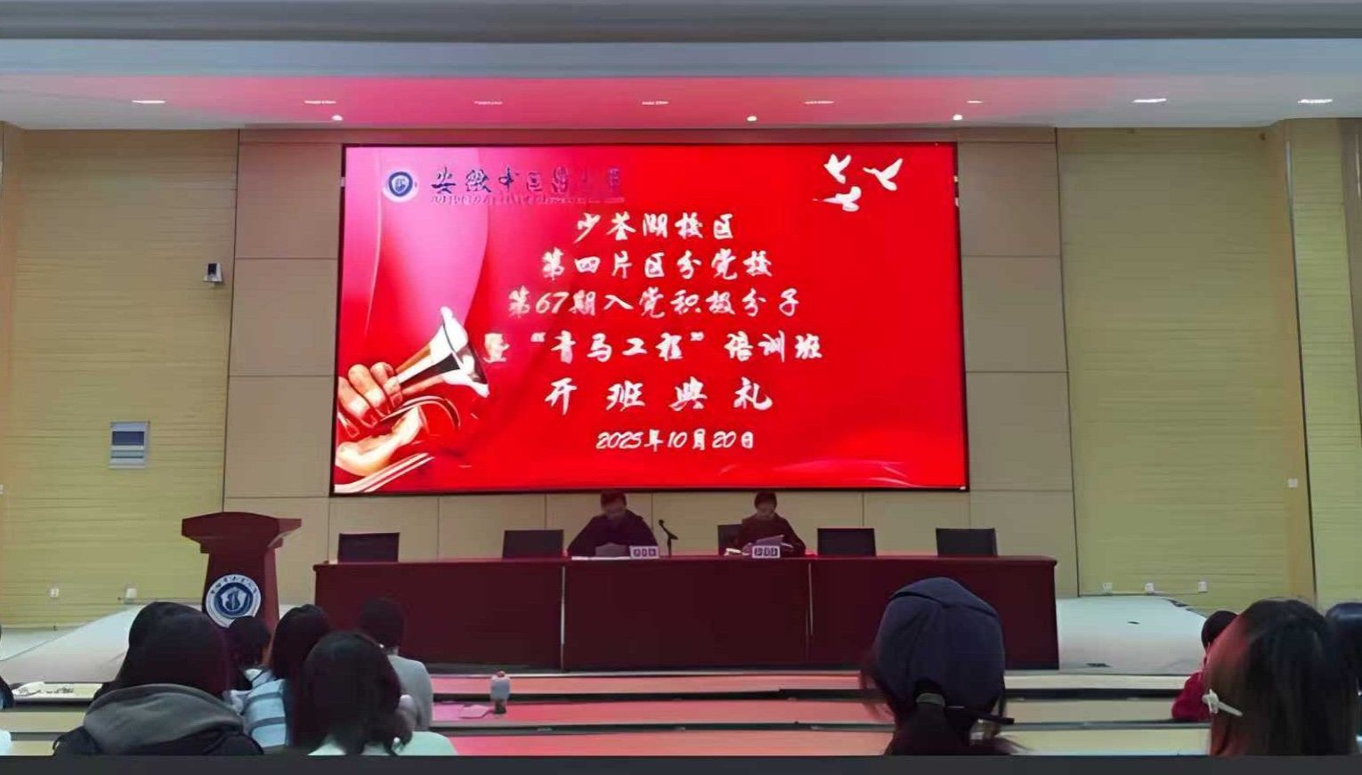 10月20日晚,安徽中医药大学少荃湖校区第四片区分党校举行第67期入党积极分子暨“青马工程”培训班开班典礼,护理学院党委、医药经济管理学院党委、人文与国际教育交流学院党总支、马克思主义学院党总支及有关负...