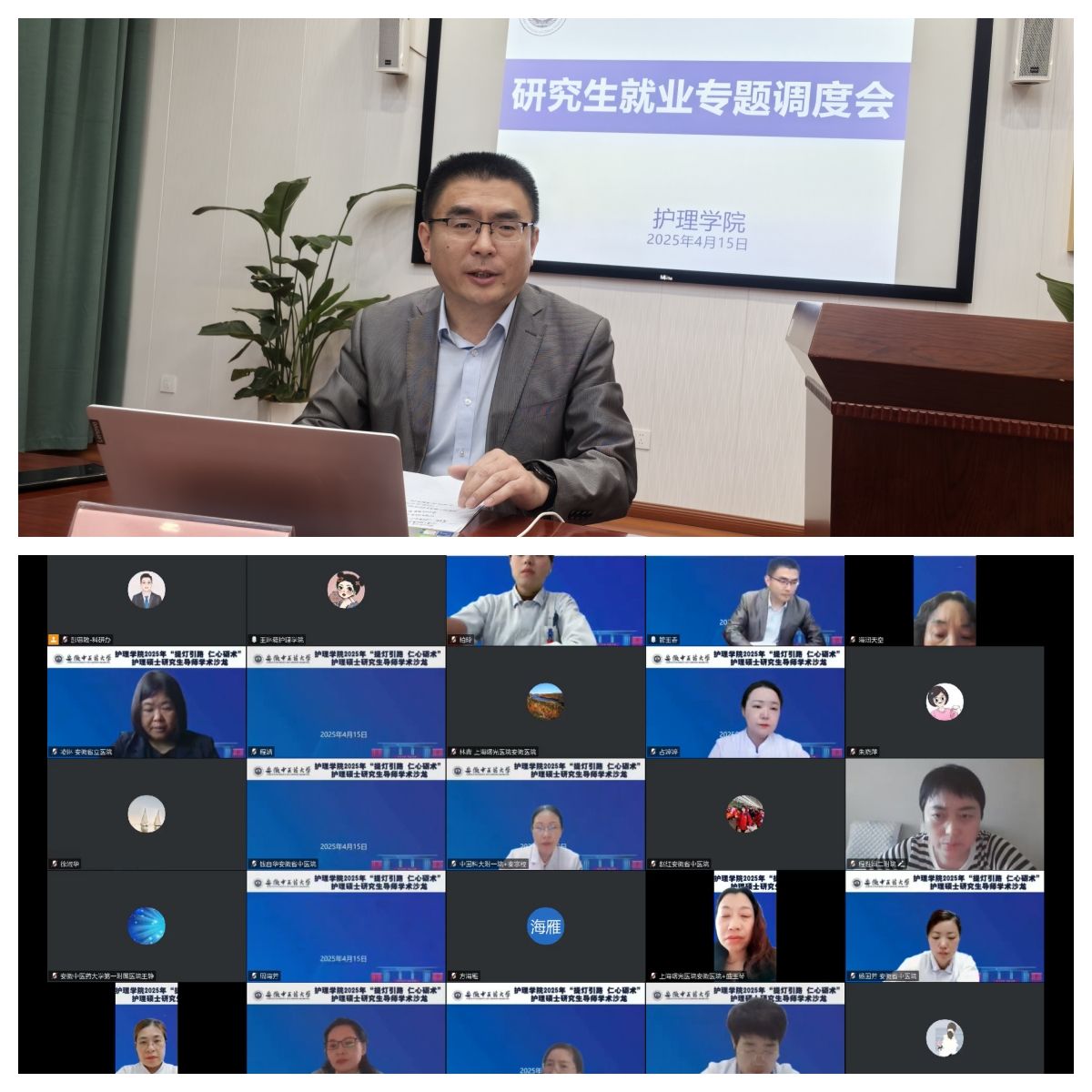 4月15日中午,护理学院召开视频会议,专题调度硕士研究生就业工作,学院班子成员、全体研究生导师及班级辅导员参会。会议分析研判了护理学专业硕士研究生就业形势和学生就业期望值及发展成长规律,就2025届硕士研...