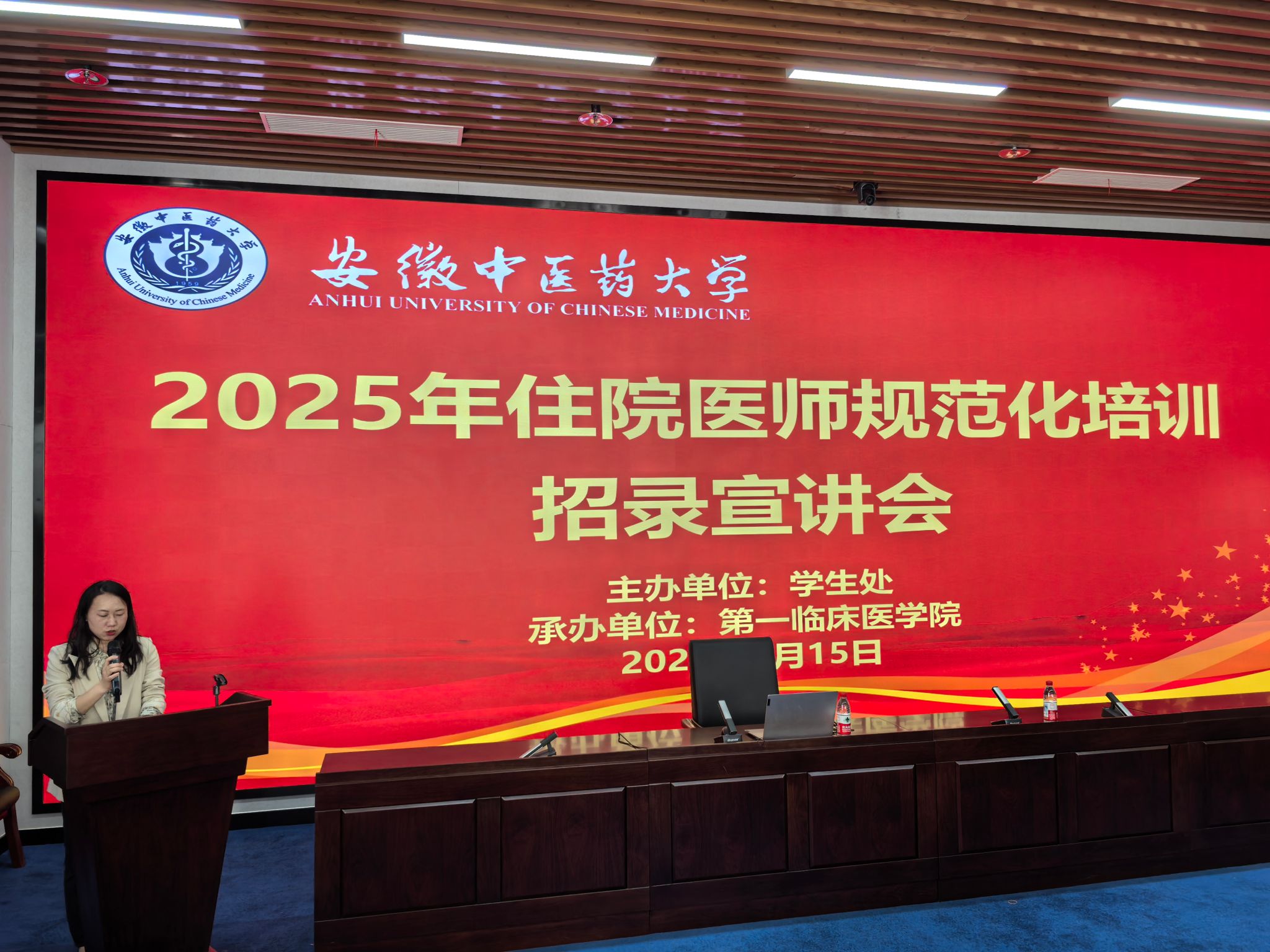4月15日下午,由学校学生处主办,第一临床医学院承办的2025年中医住院医师规范化培训招录宣讲会在梅山路校区图书馆学术报告厅举行。宣讲会邀请了第一临床医学院、芜湖市中医医院、六安市中医院、铜陵市中医医院、...
