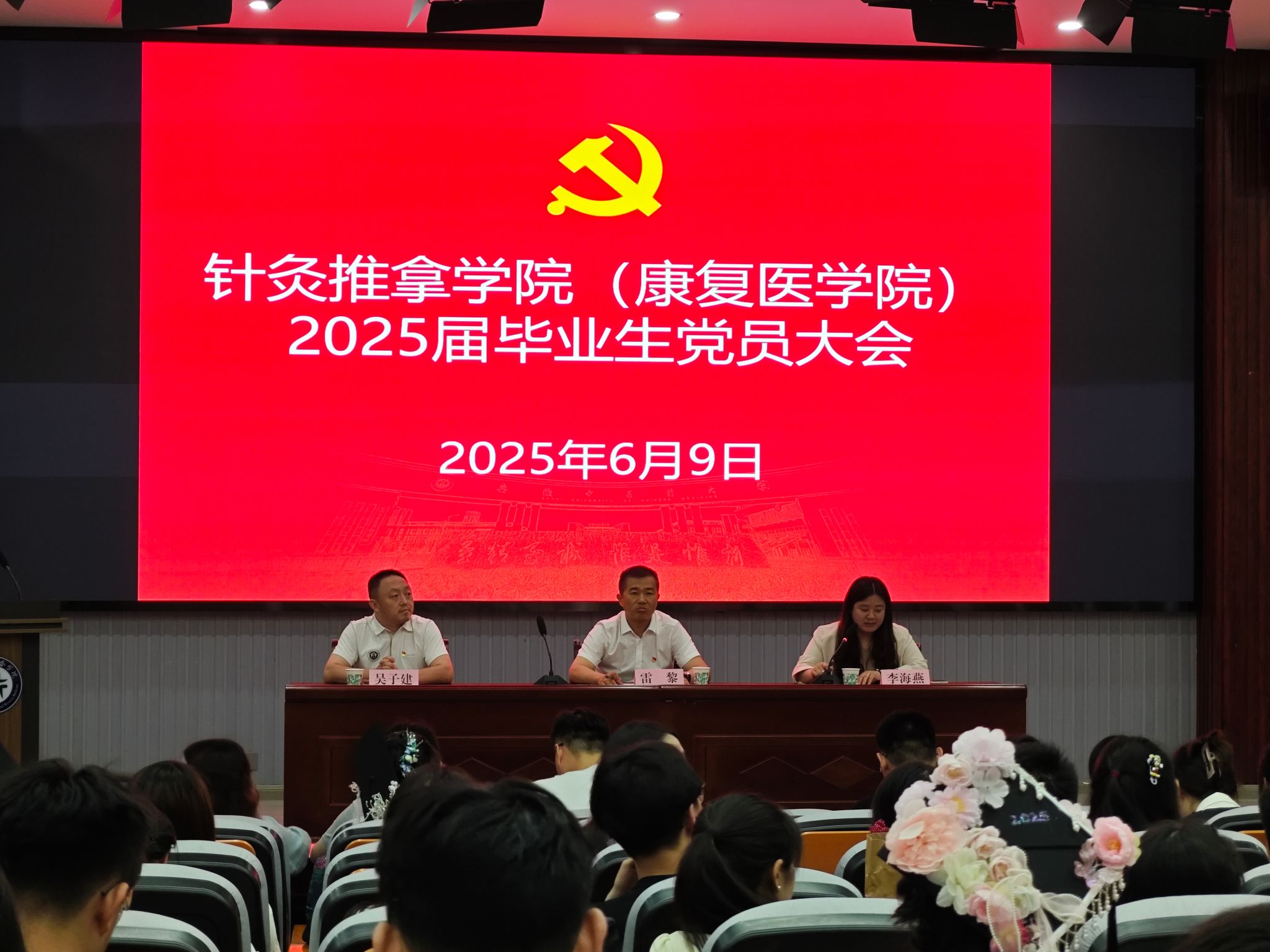 为强化毕业生党员党性修养,明确责任担当,做好毕业季党员教育管理,6月9日,针灸推拿学院召开2025届毕业生党员大会。学院党委书记雷黎、副院长吴子建出席会议,会议由学院党委副书记李海燕主持,各学生党支部书...
