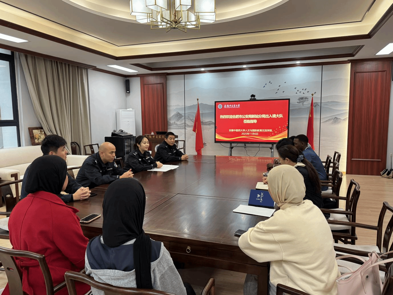为了解留学生在华学习生活现状、强化涉外普法教育,11月6日,合肥公安局新站分局出入境大队民警联合学校主管民警来院走访留学生。学院党总支副书记顾义俊,留学生教学与管理科科长、留学生辅导员以及6名2025级留...