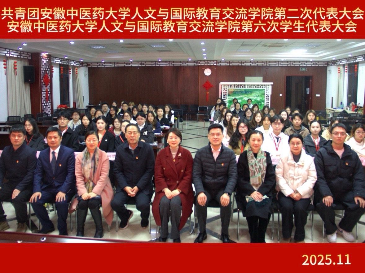 11月19日,共青团安徽中医药大学人文与国际教育交流学院第二次代表大会暨安徽中医药大学人文与国际教育交流学院第六次学生代表大会在少荃湖校区沁馨堂隆重开幕。学校团委副书记杨浩,学院领导班子成员叶兰兰、周...