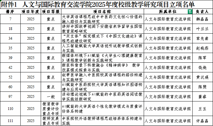 近日,学校正式公布2025年度校级教学研究项目立项结果,人文与国际教育交流学院申报工作斩获佳绩,共有11个项目成功获批立项,为学院教育教学改革深化与内涵式高质量发展注入了强劲动力。本次学院获批的11个项目...
