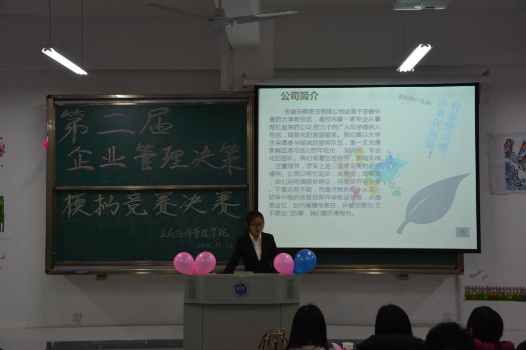 12月16日下午,医药经济管理学院第二届企业管理决策模拟大赛决赛如期举行。13和14级共十支队伍进入了最终决赛。 本场比赛中,各队选手们依然采用PPT的形式,向评委和观众展示了各自虚拟创办的企业在文...