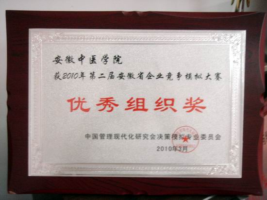 在近日结束的安徽省第二届高校企业竞争模拟大赛中,我校医药经济管理学院选派了15支代表队参加,共有4支代表队晋级最后的决赛,均获得了二等奖,我校获得优秀组织奖。李珑、周莉、方晓三人获得优秀辅导教师。(方...