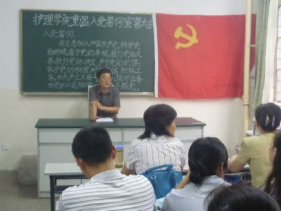 “我志愿加入中国共产党,拥护党的纲领,遵守党的章程,履行党员义务……随时准备为党和人民牺牲一切,永不叛党”。6月10日,阵阵高亢的宣誓声响彻在华佗楼106的教室里,护理学院全体党员在鲜艳的党旗下重温入党...