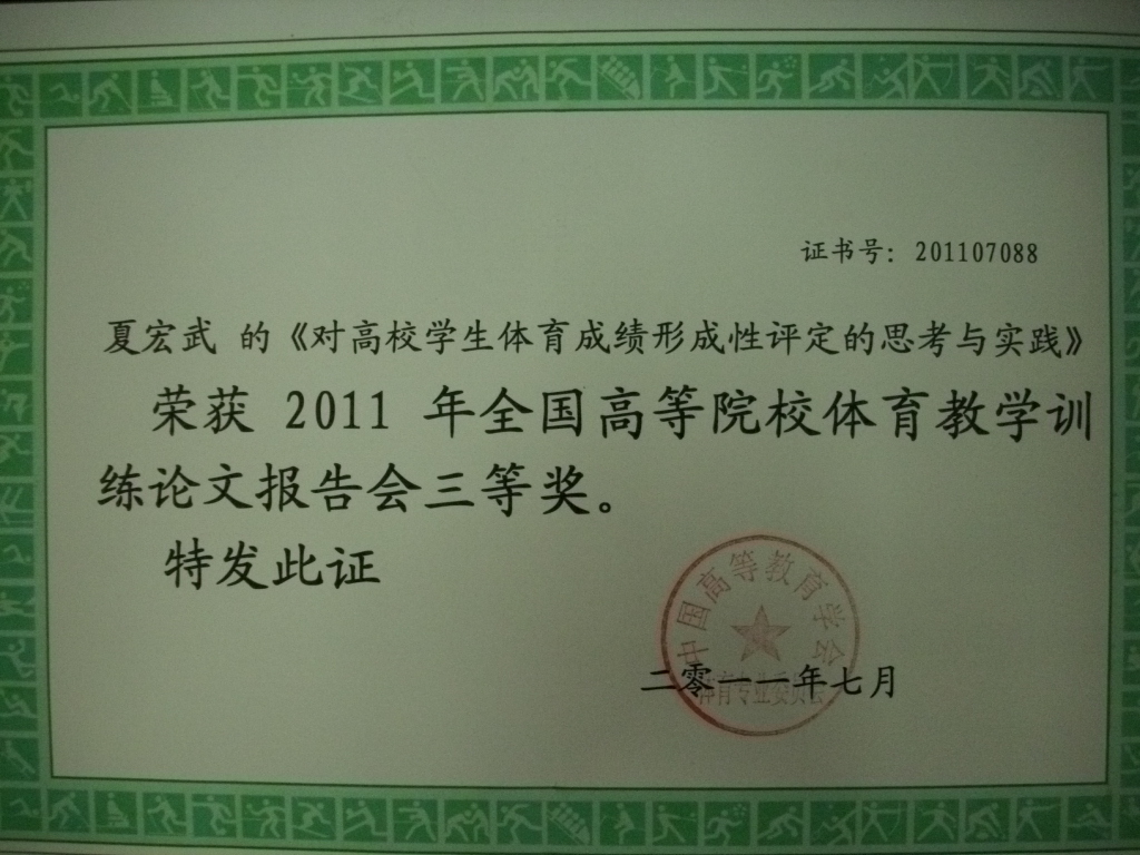 2011年全国高等院校体育教育训练学论文报告会7月31日在江西师范大学落幕。我校体育部夏宏武老师参加了大会报告,其论文《对高校学生体育成绩形成性评定的思考与实践》获得三等奖。 &n...