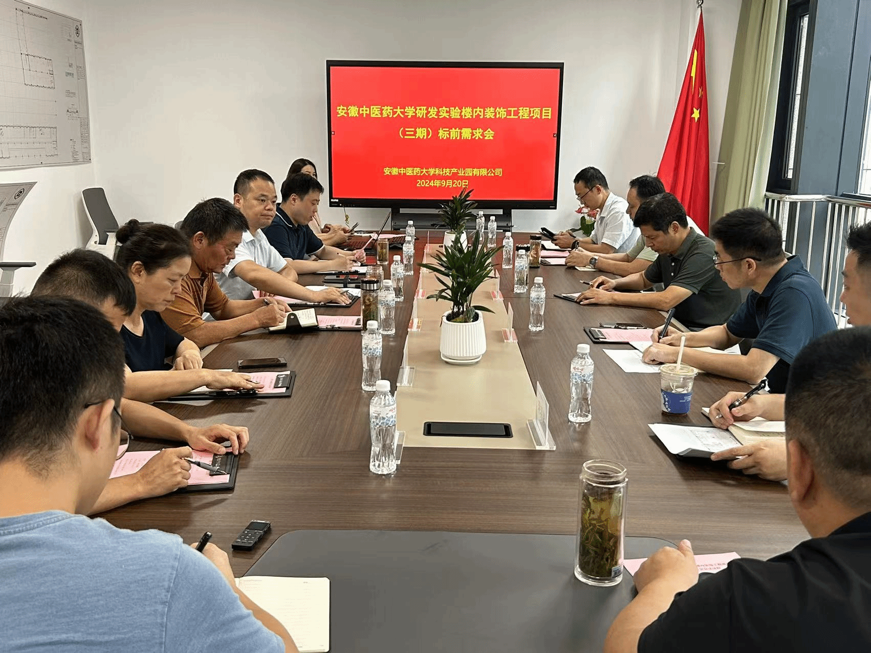 9月20日,大学科技园在科创中心9楼会议室组织召开安徽中医药大学研发实验楼内装饰工程项目(三期)标前需求会,资产经营有限公司党总支书记、董事长张亚辉,科学院办公室处长蔡荣林,科技处、资产公司、项目顾问...