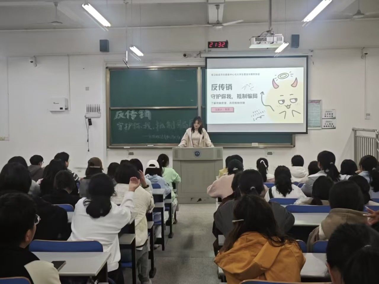 为了提高在校大学生防范传销的安全意识,10月27日晚,保卫处防诈志愿者联合团委大学生普法维权协会开展了法律知识小讲堂系列活动之“反传销——守护你我,抵制骗局”主题宣讲活动。防诈志愿者刘洁从什么是新型传...