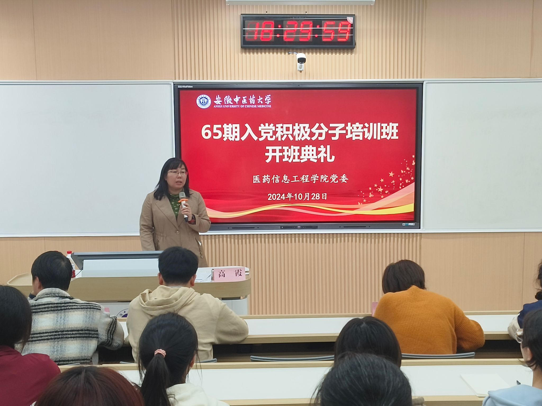 10月28日,安徽中医药大学医药信息工程学院第65期入党积极分子培训班顺利开班,学院党委书记高霞,组织员(正处级)吴成海,党委副书记、纪委书记李亚,学生党支部书记,以及本期115名学员参加本次开班典礼,典礼...