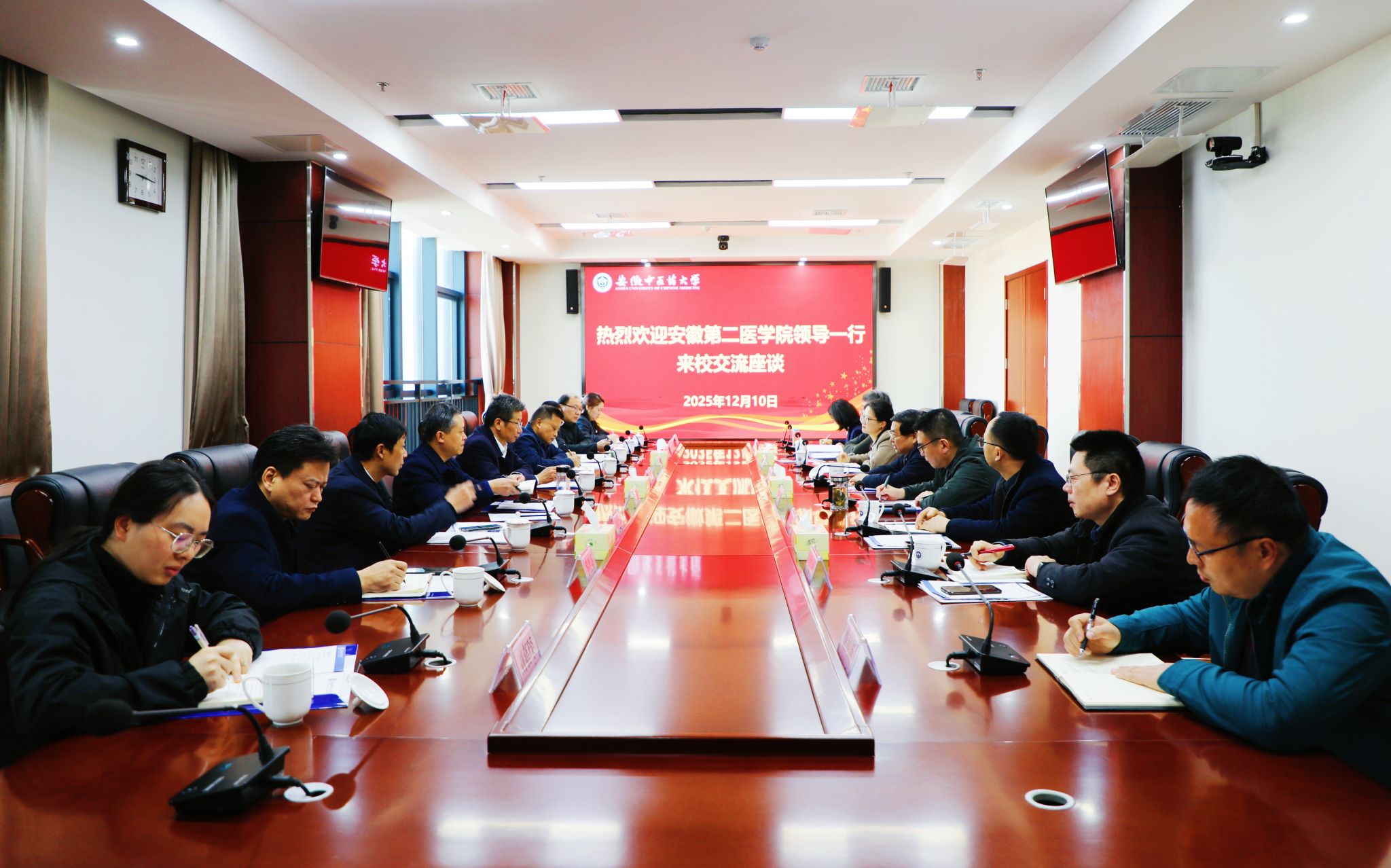 12月10日上午,安徽第二医学院党委书记姚文兵一行来校调研交流,校党委书记谢瑞瑾主持召开交流座谈会,校党政办公室、人事处、发展改革处、科技处、社会合作处、平台管理处相关负责人参会。谢瑞瑾向姚文兵一行来...