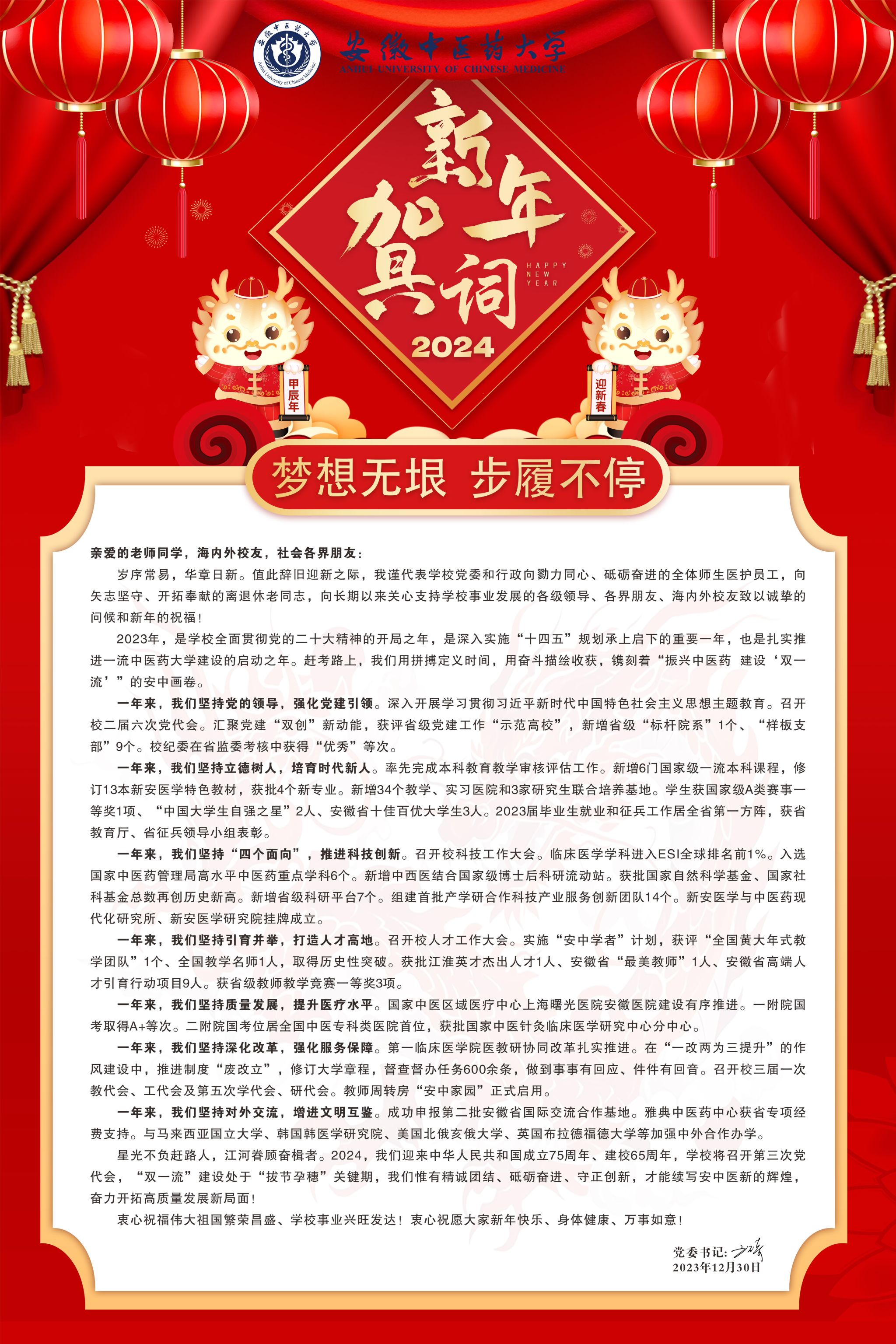 梦想无垠,步履不停——2024年新年贺词亲爱的老师同学,海内外校友,社会各界朋友:岁序常易,华章日新。值此辞旧迎新之际,我谨代表学校党委和行政向戮力同心、砥砺奋进的全体师生医护员工,向矢志坚守、开拓奉...