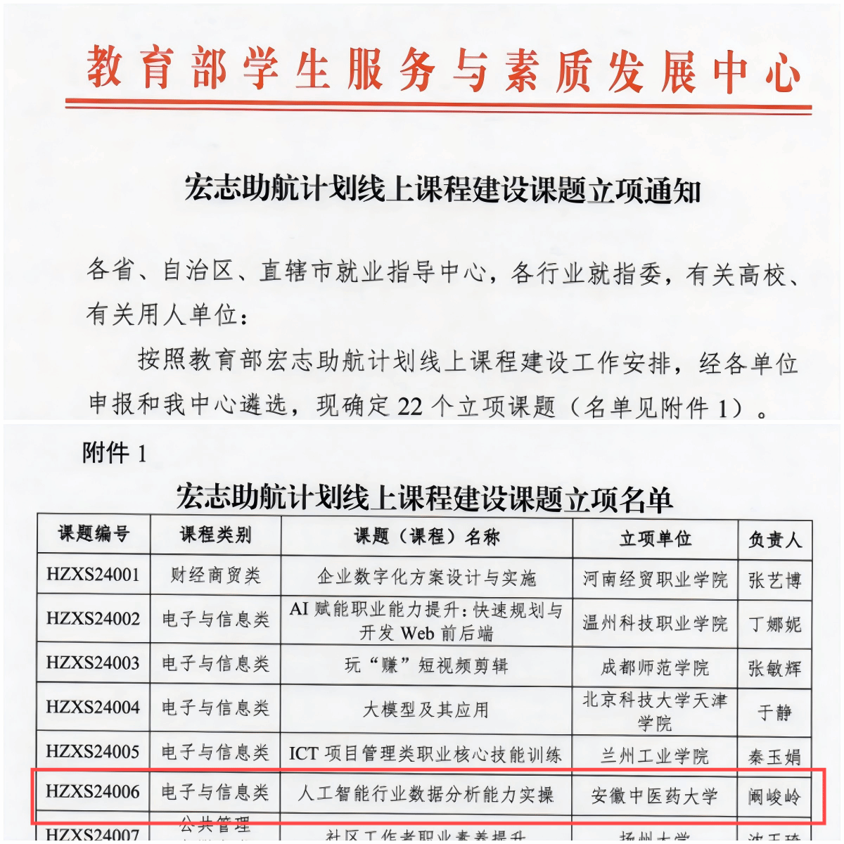 日前,教育部学生服务与素质发展中心公布了2024年宏志助航计划线上课程建设课题立项通知,我校医药信息工程学院申报的《人工智能行业数据分析能力实操》获批立项建设。 根据安徽省教育厅该项工作部署要求,课题被...