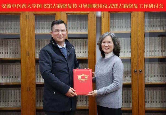 12月16日上午,校图书馆举办古籍修复传习导师聘用仪式暨古籍修复工作研讨会,聘请国家级古籍修复师肖晓梅为图书馆古籍修复传习导师。校党委常委、机关党委书记、巡察办主任罗绍明,安徽省高等学校图书情报工作委...