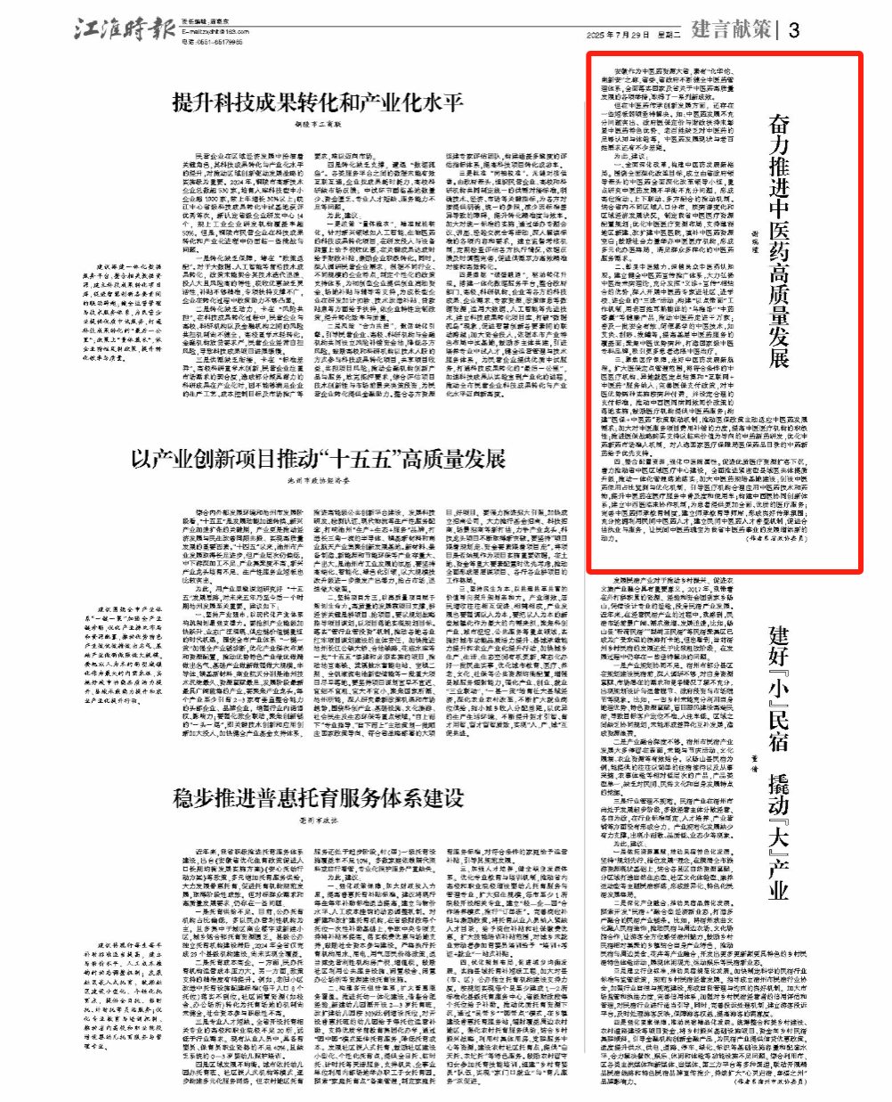 7月29日,省政协机关报《江淮时报》刊发了省政协委员、我校党委书记谢瑞瑾的建言献策文章《奋力推进中医药高质量发展》。全文如下:奋力推进中医药高质量发展安徽作为中医药资源大省,素有“北华佗、南新安”之称...