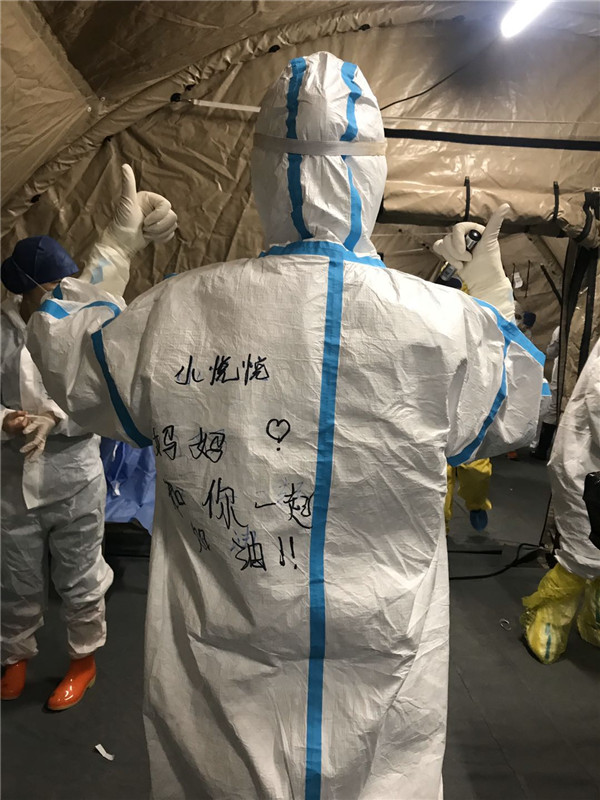 这里的病人很多都患有不同程度的基础疾病,如糖尿病、高血压、肾脏疾病等,其中有一位老爷子透析了20多年,有此肺炎,真是重重一击,好在老人家依旧精神矍铄,信心满怀。这是何等的坚韧不拔!芳,你要是看见了,一定也会和我一样给老爷子竖起大拇指!病人们看到我们支援队伍的到来,看到我们防护服上备注的各自的单位和姓名,纷纷对我们表达了感激,受此鼓舞,我也更加干劲十足!一天的工作结束了,我已经对工作流程和环境有了大致的熟悉,你不必为我挂心,后续的工作我会听从组织安排,有条不紊地进行。