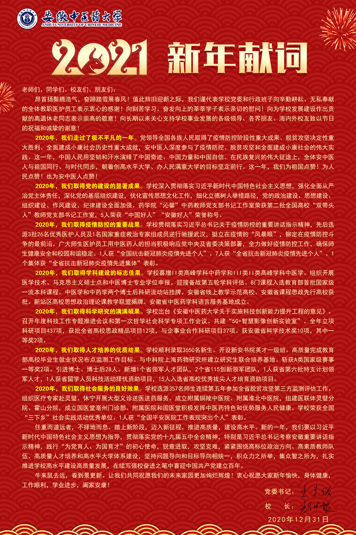 2020年,我们走过了极不平凡的一年。党领导全国各族人民取得了疫情防控阶段性重大成果、脱贫攻坚决定性重大胜利、全面建成小康社会历史性重大成就,安中医人深度参与了疫情防控、脱贫攻坚和全面建成小康社会的伟大实践。这一年,中国人民用坚韧和汗水演绎了中国奇迹、中国力量和中国自信。在民族复兴的伟大征途上,全体安中医人与祖国同行、与时代同步,朝着创高水平大学、办人民满意大学的目标坚定前行。这一年,我们为祖国点赞!为人民点赞!也为安中医人点赞!