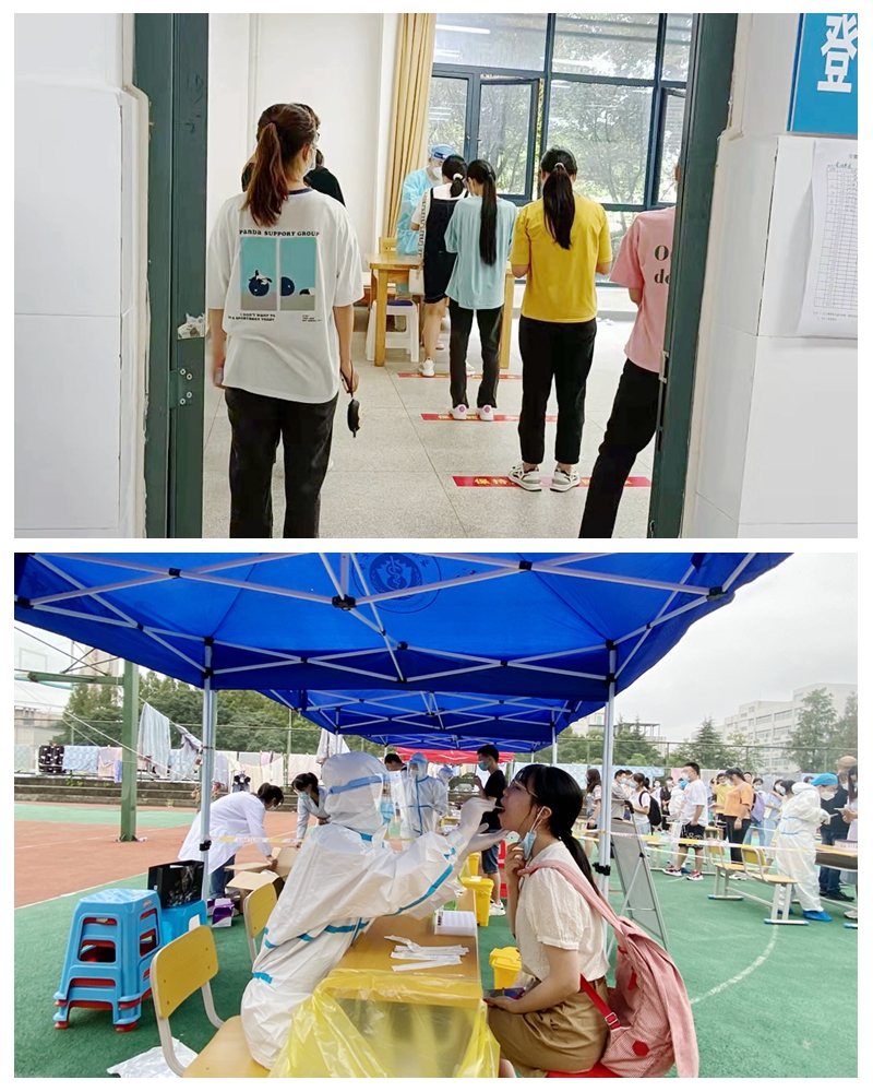 为做好重点地区和重点人群核酸检测工作,确保做到全覆盖、无遗漏。学校总务处(校医院)、学生处积极配合,落实好检测现场测温、佩戴口罩、“一米线”等措施,加强现场秩序维护,防止人员扎堆聚集。现场医务人员及街道、社区、站队所工作人员严格操作规范,加强自身防护。此次校园核酸检测,共设置测温区、登记区和采集区及临时隔离观察点四个区域,师生在通过核酸检测入口处后,在测温区测量体温,体温正常进入登记区核验健康码,健康码为绿码即直接进入采集区,不到一分钟一次核酸检测便可完成,此次核酸检测是疾控和学校集中免费检测,师生不需要自己去找检测机构,省时省力,方便快捷。