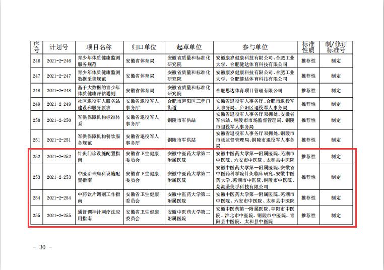 日前,安徽省市场监督管理局下达2021年度地方标准计划,我校第二临床医学院此前申报的6项地方标准均在计划之列。这是安徽省首次将中医药相关服务标准纳入到地方标准计划之列。
