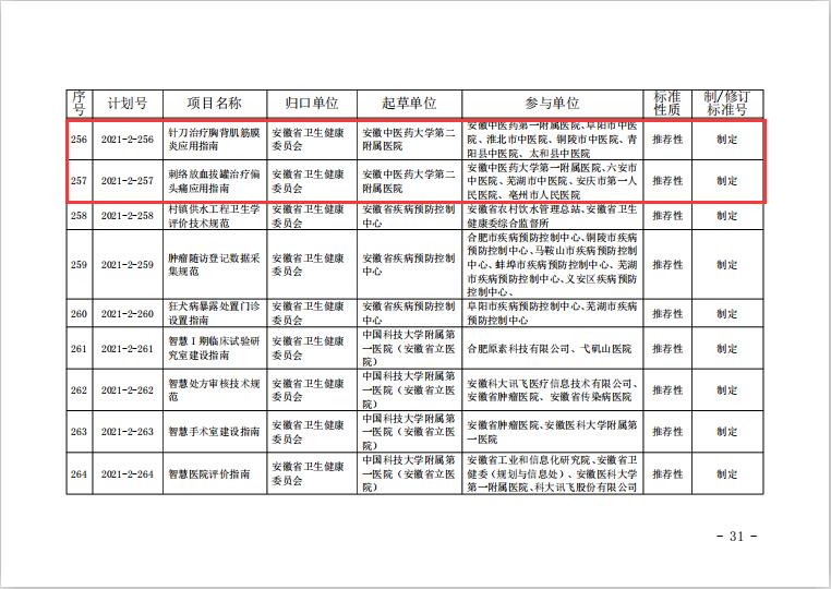 我校第二临床医学院作为国家级中医医疗服务标准化试点建设单位和国家中医药管理局中医药标准研究推广基地,一直致力于中医药标准化工作的开展,在中医药技术标准和服务标准研制方面积累了丰富的经验。此次6项地方标准的立项,将为安徽省中医药服务地方标准工作打开新局面,为进一步规范全省中医药服务标准、提升中医药服务水平、彰显中医药地方特色提供有力支撑。(王婧吉/文 雷黎/审核 尤志成/编发)