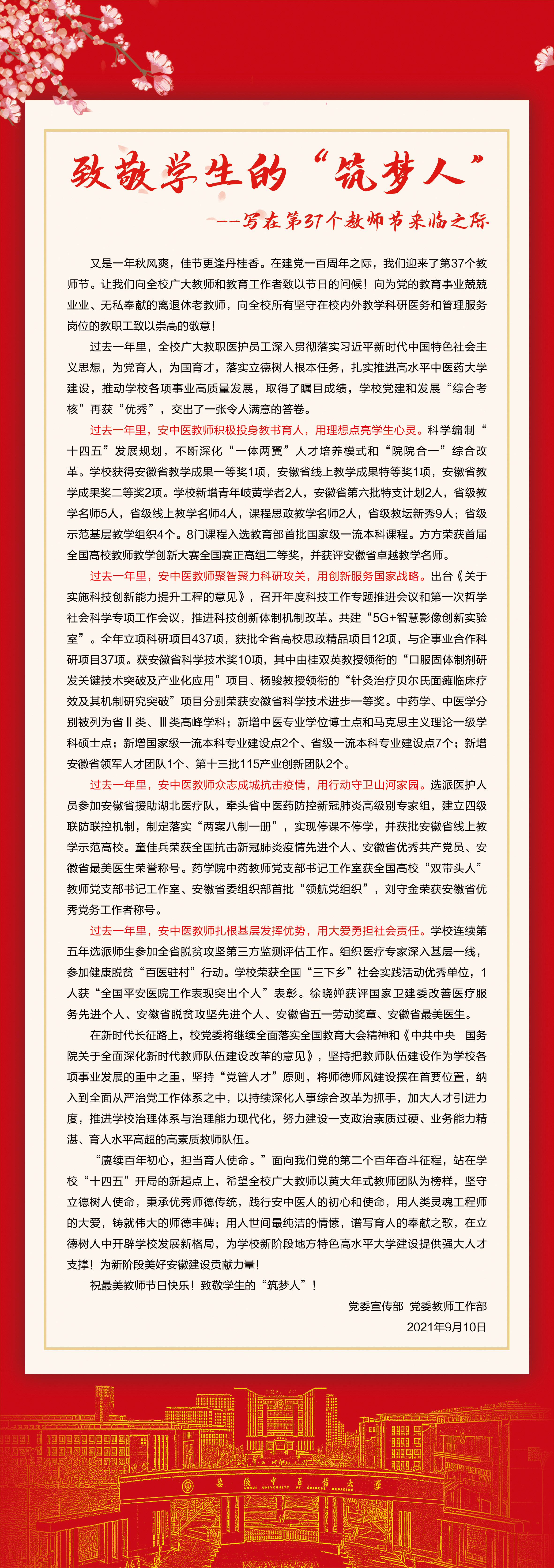 又是一年秋风爽,佳节更逢丹桂香。在建党一百周年之际,我们迎来了第37个教师节。让我们向全校广大教师和教育工作者致以节日的问候!向为党的教育事业兢兢业业、无私奉献的离退休老教师,向全校所有坚守在校内外教学科研医务和管理服务岗位的教职工致以崇高的敬意!