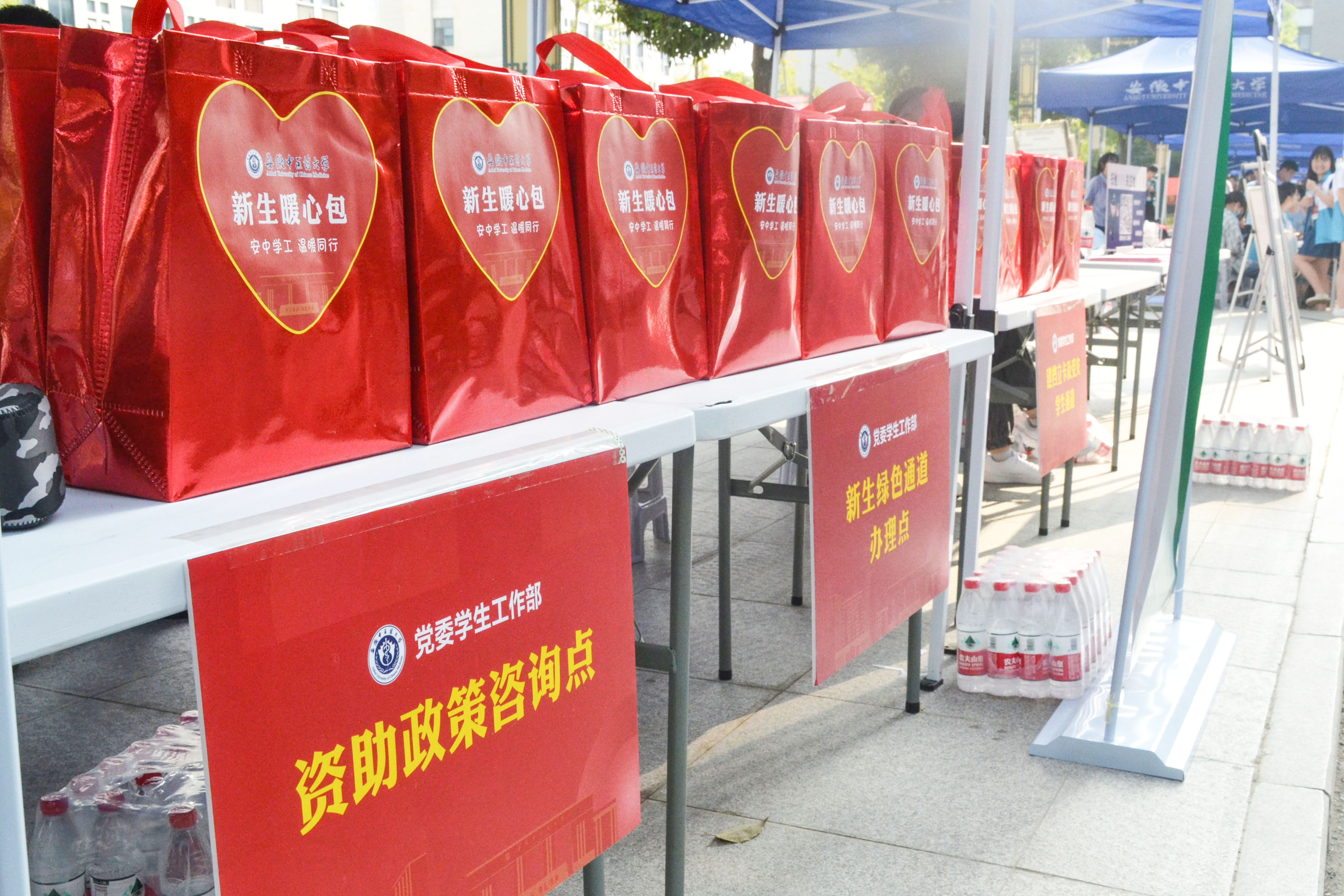 在2021级本科新生报到当天,为保障家庭经济困难学生能够顺利入学,安徽中医药大学党委学工部在报到现场设立“绿色通道”,向家庭经济困难学生和遭受洪涝灾害学生提供一系列无忧入学服务,精准落实国家资助政策。当日,约200名建档立卡家庭经济困难新生和假期遭受洪涝灾害的新生通过“绿色通道”获得“新生暖心包”专项资助,暖心包中精心准备了十份礼品,寓意十全十美,内含一个爱心保温杯、一份定制安中医笔记本套装、一个定制钥匙扣、一台护眼阅读灯、一根跳绳、一本励志书籍和一个励志书签,旨在激励他们步入大学生活后自立自强,积极进取,做全面发展的优秀大学生。