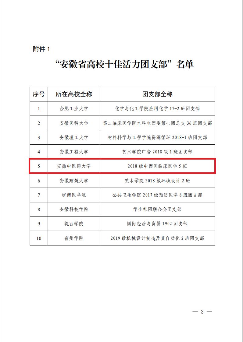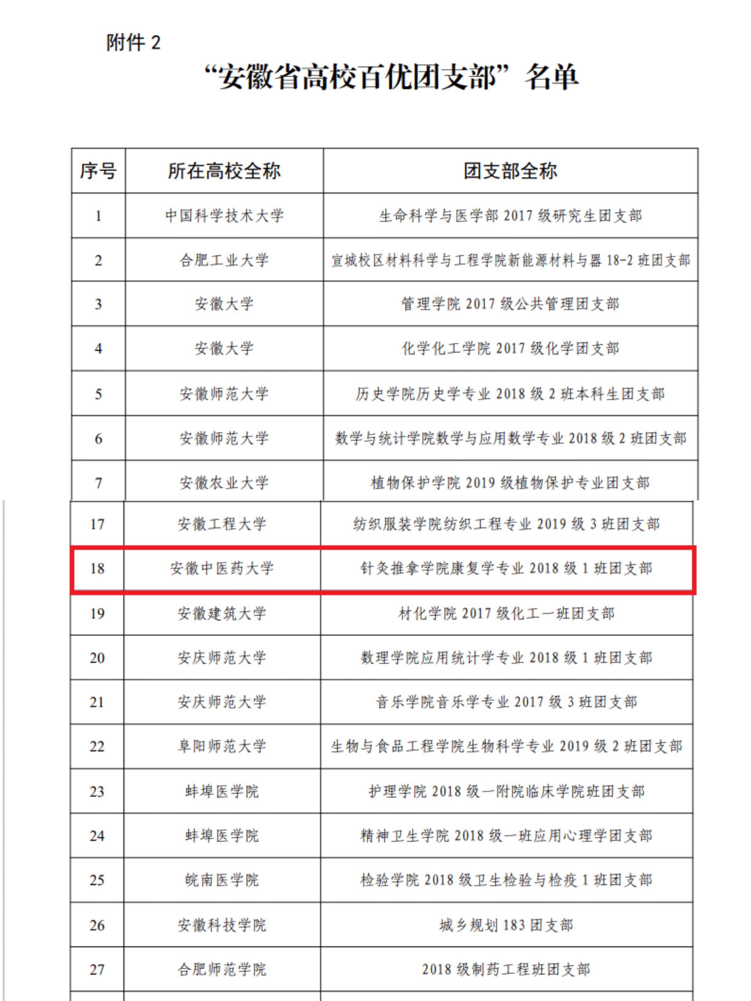 经过各高校初评、团省委及团中央专家评审团评审等环节,我校2018级中西医临床医学5班团支部(辅导员:董琪老师)荣获“全国活力团支部”及“安徽省高校十佳活力团支部”称号,针灸推拿学院康复学专业2018级1班团支部(辅导员:聂多伟老师)获评“安徽省高校百优团支部”。