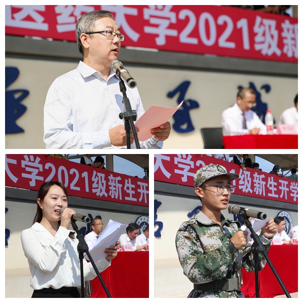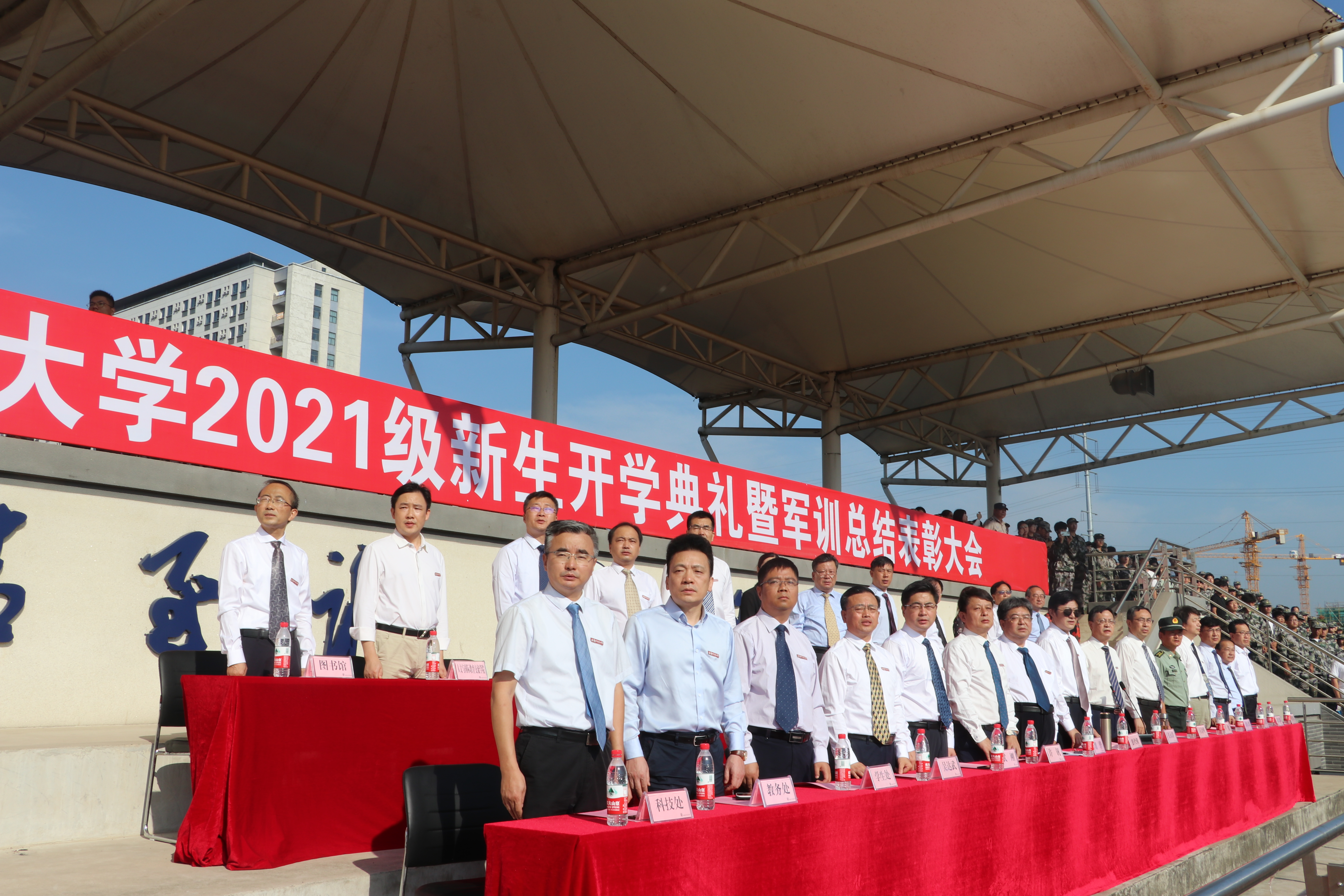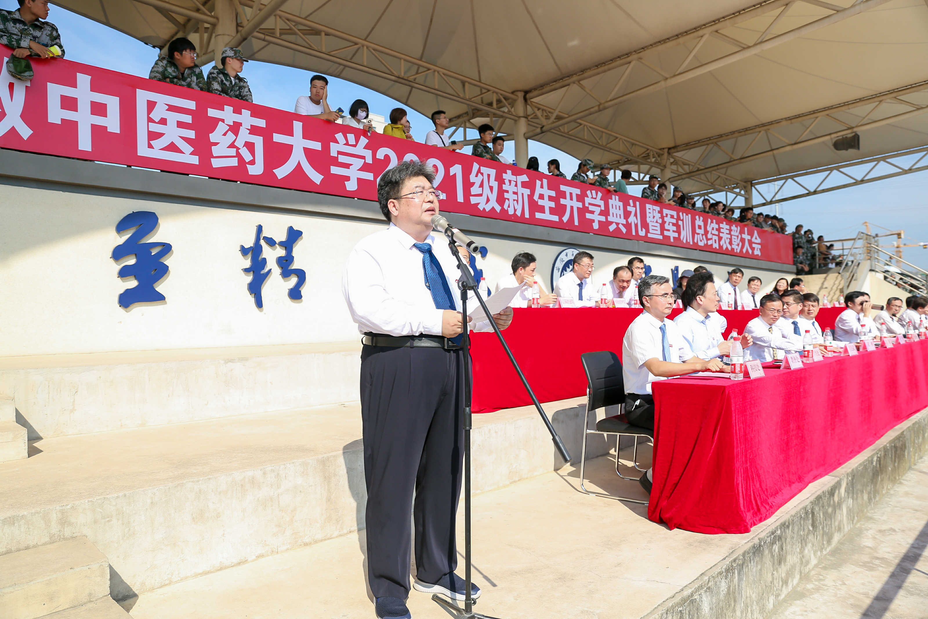 校长彭代银以《励志耕耘 逐梦青春》为题作大会讲话,他首先对2021级全体新同学表示热烈欢迎,向辛勤培育学子的学生家长表示崇高的敬意!向参加典礼的各位领导和老师们表示诚挚的问候!向承担本次军训任务的教官们表示衷心的感谢!他希望,全体新生在大学里要找准人生定位,确立理想目标,一是要坚定文化信仰,不忘初心,与梦同行;二是秉承仁心仁术,以爱之名,修德立身;三是要打牢专业基础,勤学善思,明辨笃行;四是要树牢锻炼意识,强健体魄,砥砺意志。他勉励同学们不要停止学习的脚步,只有努力才能拨开未知的迷雾;不要误解大学是自由的天堂,只有自律才能帮助我们走向辉煌;不要忽略与人交往,只有团结合作才能支撑起初心和梦想;不要忘记独立思考,只有真知灼见才能通往智慧的海洋。面向新的起点,新的征程,希望全体新生能够在“至精至诚,惟是惟新”的校训精神的指引下,励志耕耘,逐梦青春!我会在这里见证你们的成长,与你们一起跋山涉水,一起风雨兼程,一起寻医问药,最终一起满载而归!