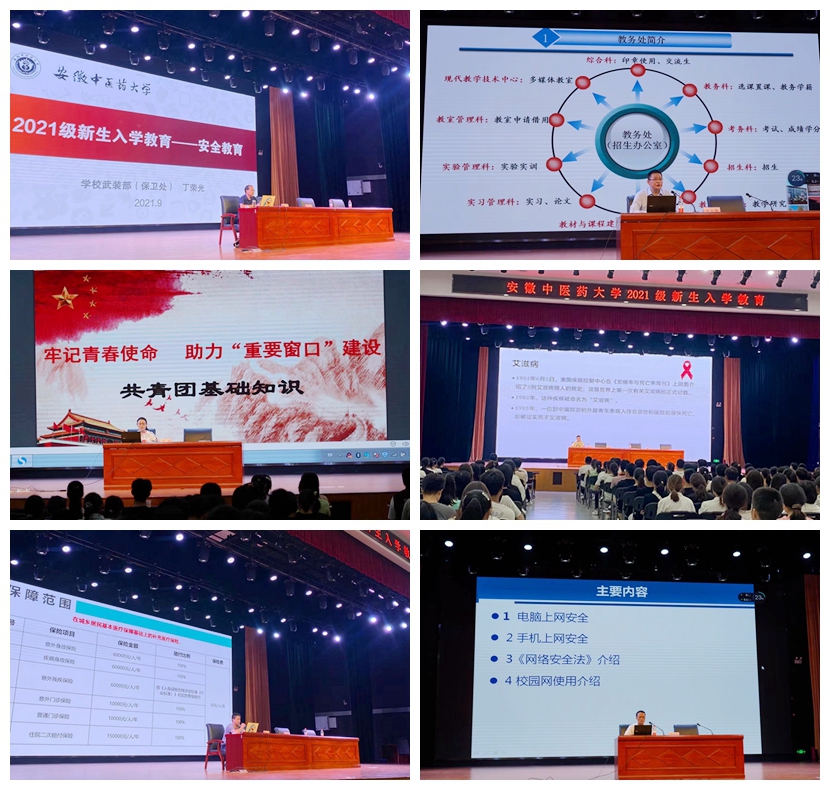 9月27日至28日,学校教务处、保卫处、网络中心、团委等部门相关工作负责人分别围绕健康教育、安全教育、学在安中、网络安全教育和班团建设等方面进行介绍,学校还特别邀请安徽省疾控中心侯赛老师为同学们进行高校传染病防治专题报告。入学教育通过视频直播的形式,大学生活动中心主会场和各教室设分会场同步学习。