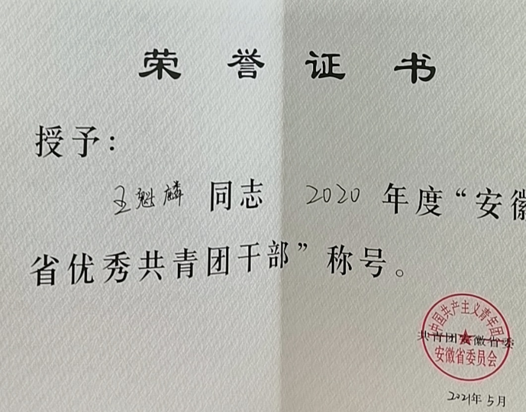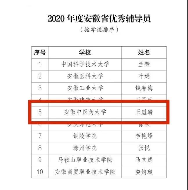 今年9月,中共安徽省委教育工委公布“2020年度安徽省高校辅导员年度人物和优秀辅导员”评选结果,我校药学院辅导员王魁麟荣获“2020年度安徽省优秀辅导员”、“2020年度安徽省优秀共青团干部”两项省级荣誉称号。