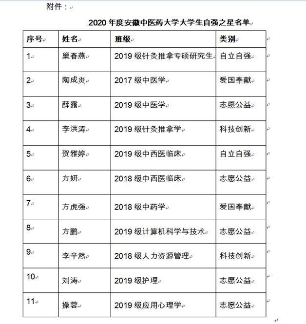 此项工作启动以来,校团委积极动员宣传,组织广大同学踊跃报名。经学生自荐、学院审核推荐、学校评审,经公示无异议,最终评选巢春燕等11位同学为“安徽中医药大学大学生自强之星”。