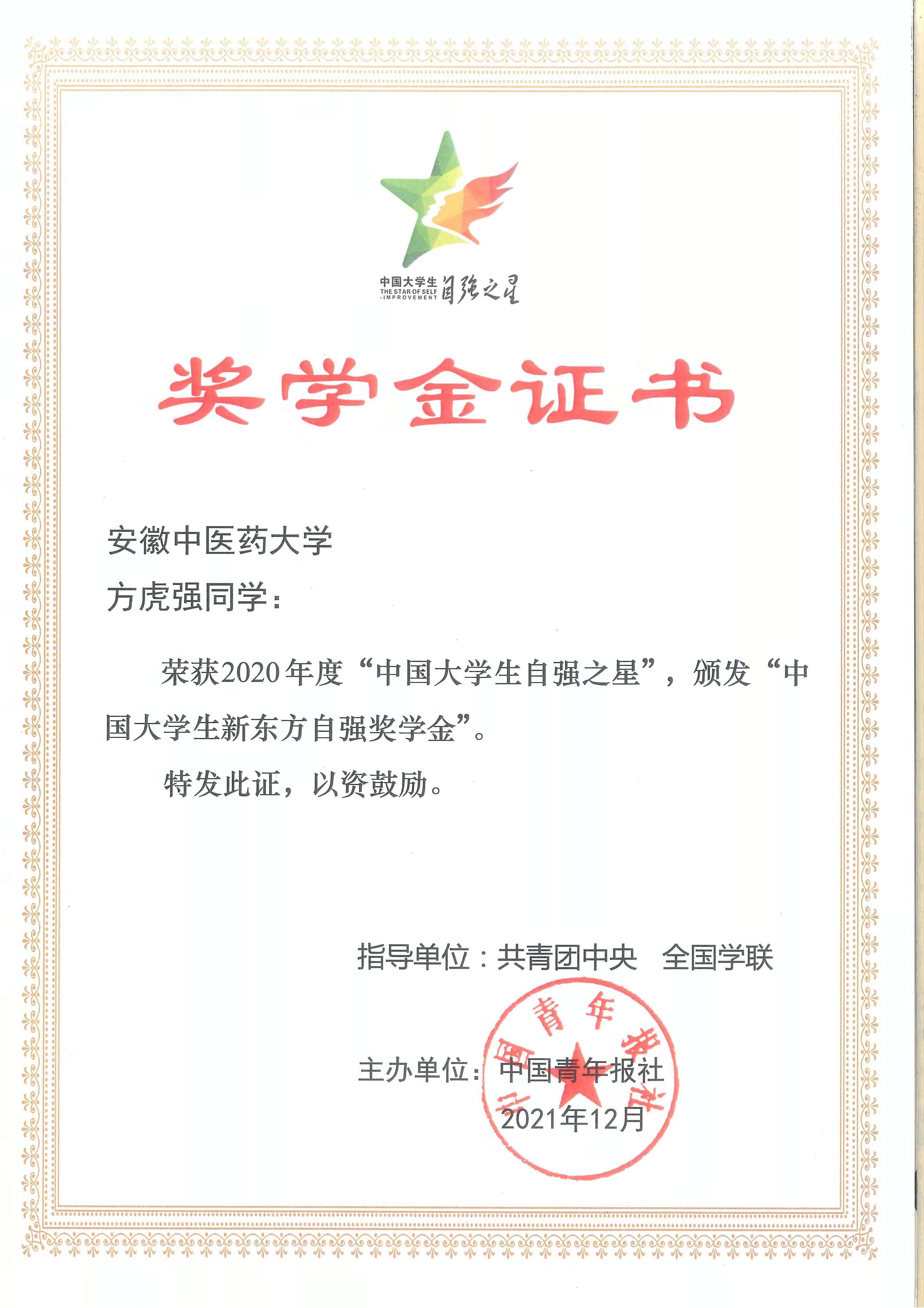 “踏实肯吃苦的帅小伙”,这是安徽中医药大学辅导员张明燕老师对自己的学生、2021年度中国大学生“自强之星”方虎强的评价。2000年出生的方虎强,是安徽中医药大学药学院2018级中药学专业学生,荣获2019年度安徽省大中专学生志愿者暑期“三下乡”社会实践活动优秀个人、2020年度安徽省“百优大学生”及第十八届全国中药标本馆标本竞赛一等奖、三等奖等荣誉。