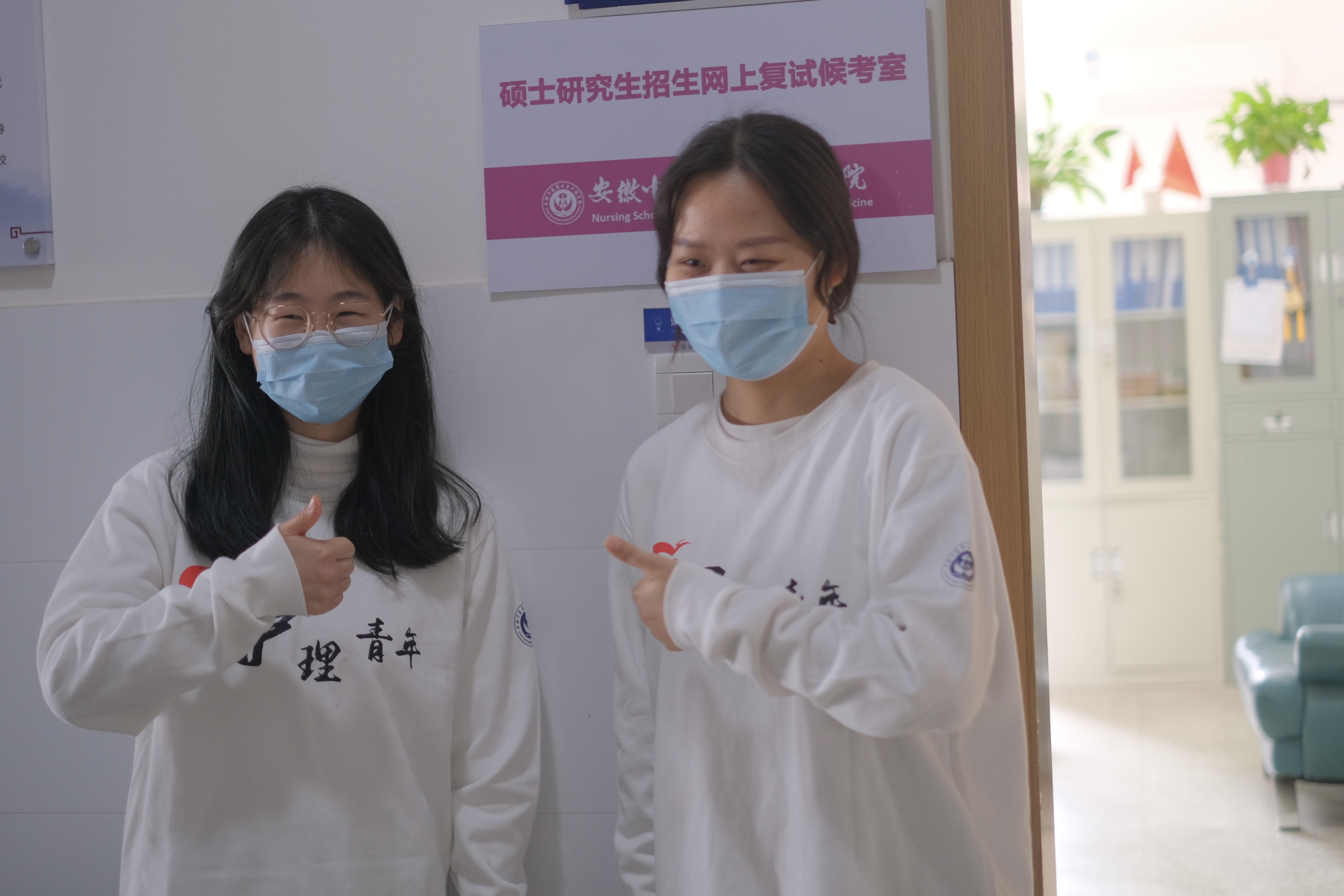 为了给考生们营造温馨、舒适、放松的复试环境,护理学院、医药信息工程学院在“暖心复试间”中摆放了鲜花、国旗等。志愿者们手持“‘研’途高飞”“一‘研’为定”“护院有爱,护你上岸”等暖心标语为考生们打气加油。护理学院发动志愿者全程服务考生,如遇突发状况,能够在第一时间协助考生解决困难,及时联系辅导员老师,在考生复试结束后,及时对专用教室进行消杀,保证防疫不断线。