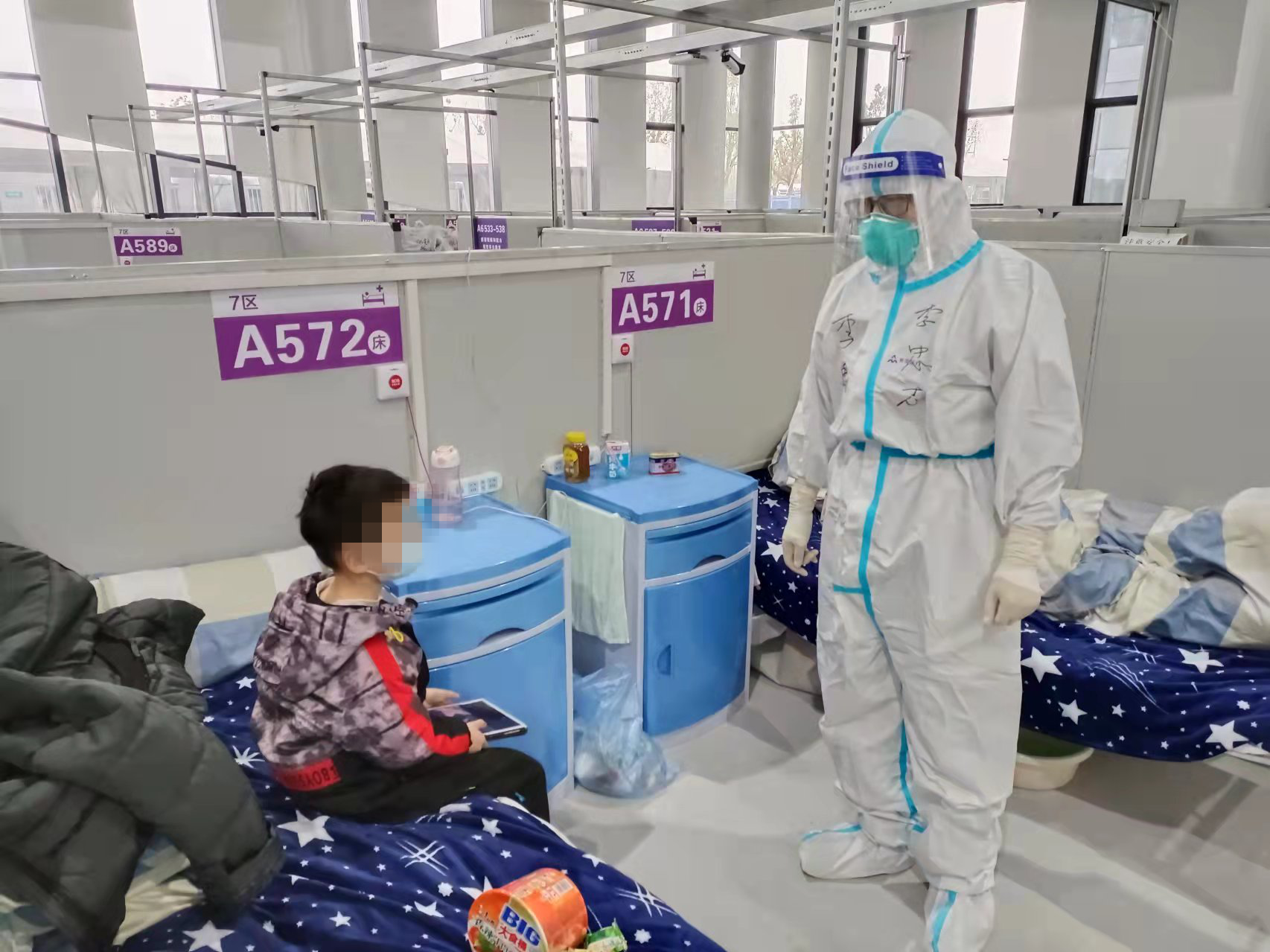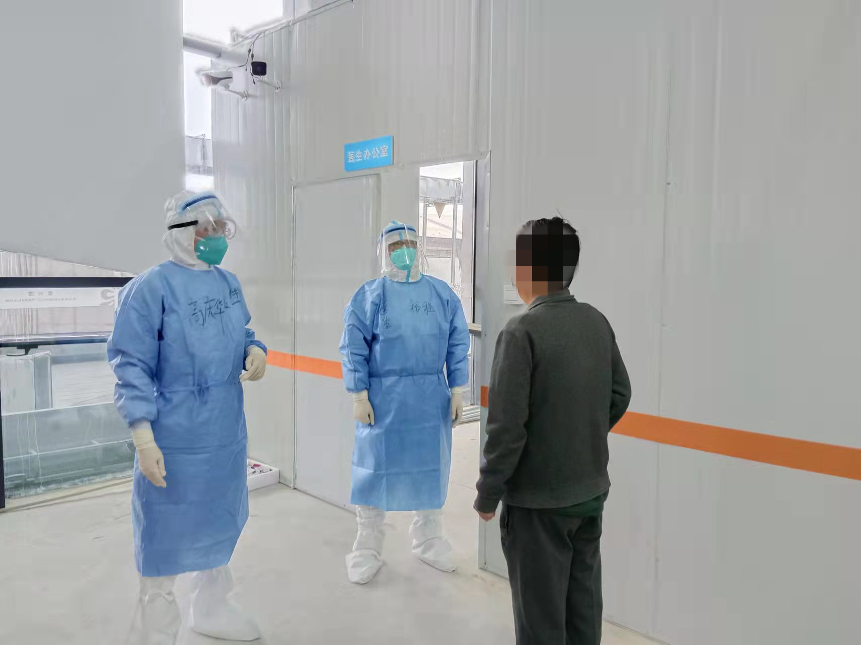 4月4日,第一临床医学院队员杨程在上海崇明岛复兴馆方舱医院B舱向进舱隔离出现咳嗽、咳痰的患者进行问诊