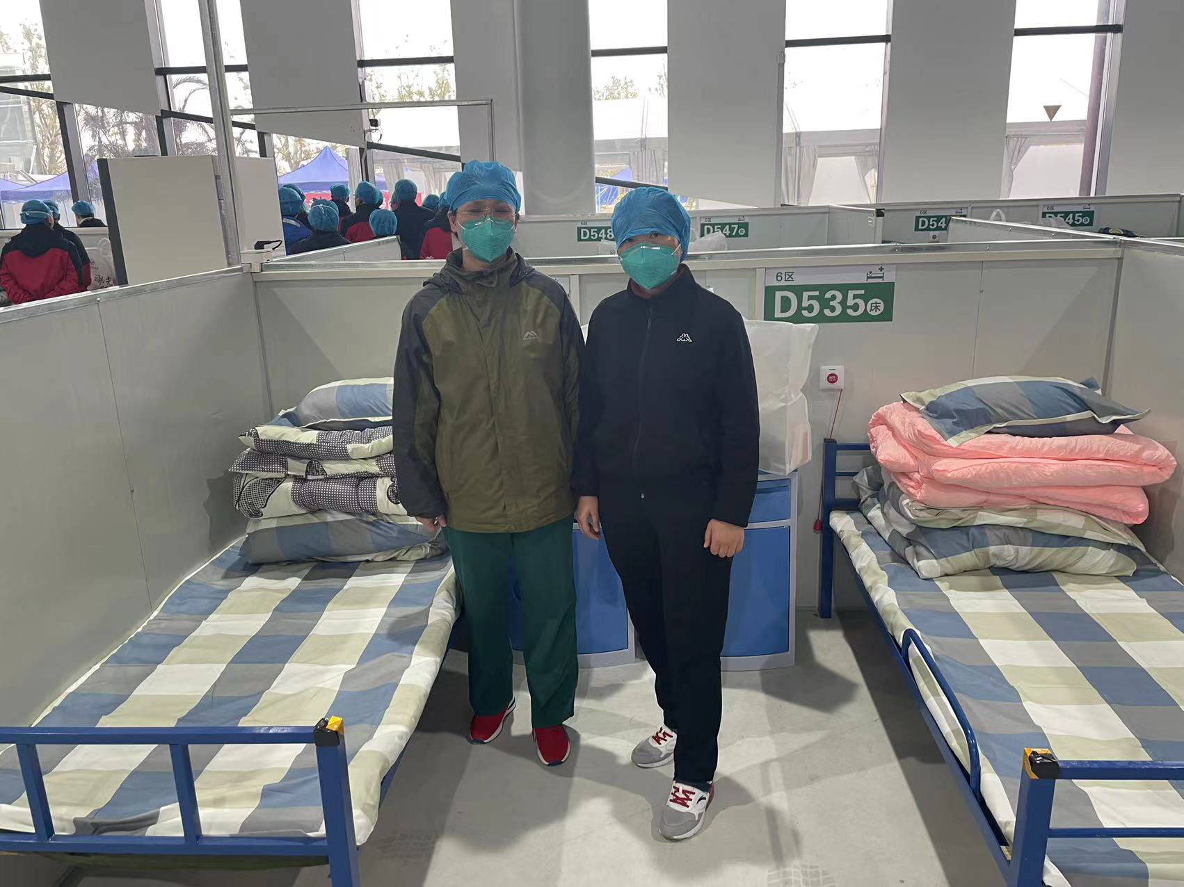 4月5日,第一临床医学院队员刘丽丽、张静在花博园复兴馆方舱医院D舱走流程,为进方舱作最后准备工作