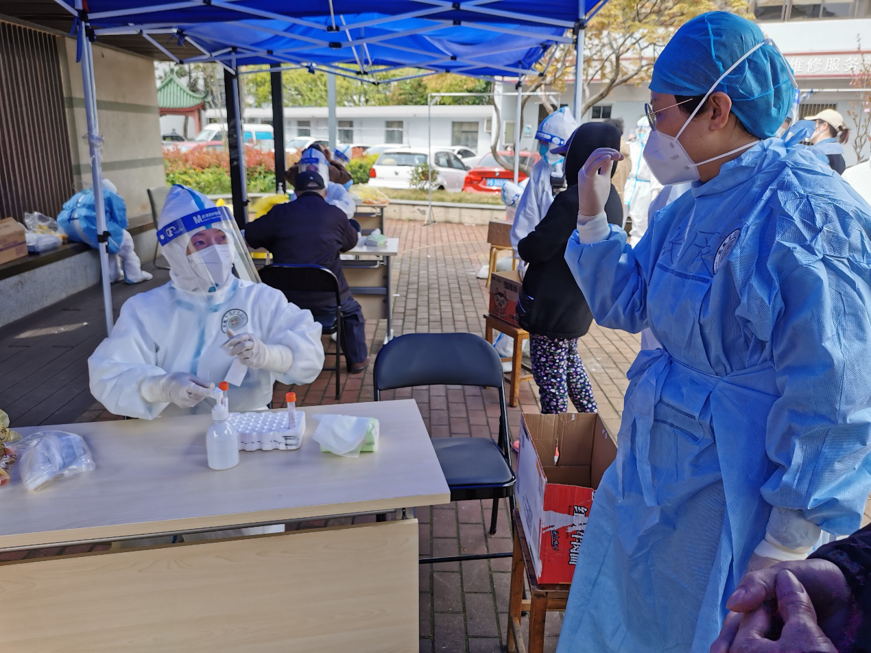 自抵达上海的第一刻起,2位院感专家赵红与张星辰便对核酸采样队员进行现场个人防护、规范采样注意事项等岗前培训,并来到核酸采样一线,检查指导采样队员及时更换破损手套、在合适位置更换防护用品、规范手消操作,避免人群之间交叉感染,降低感染风险。