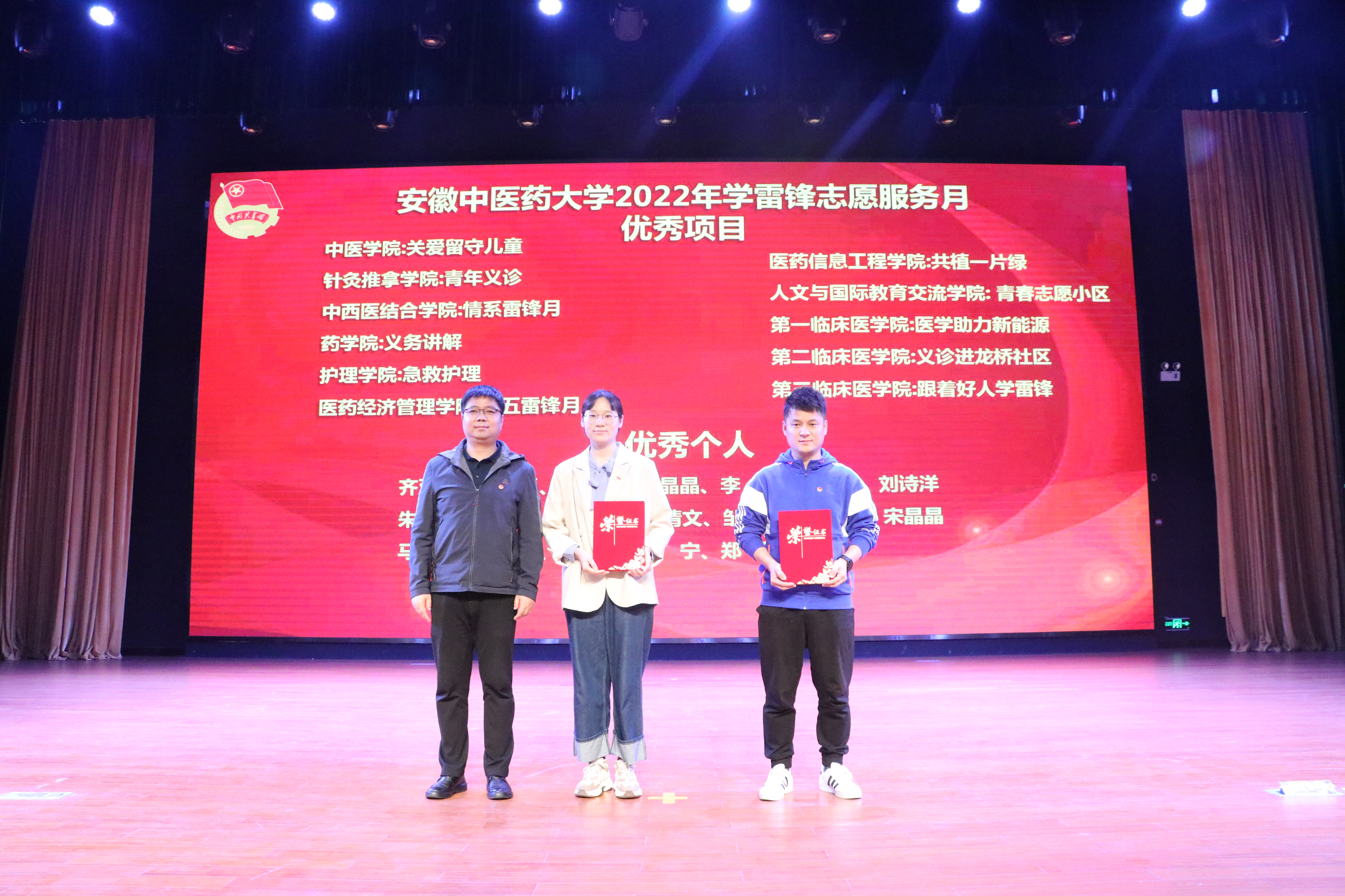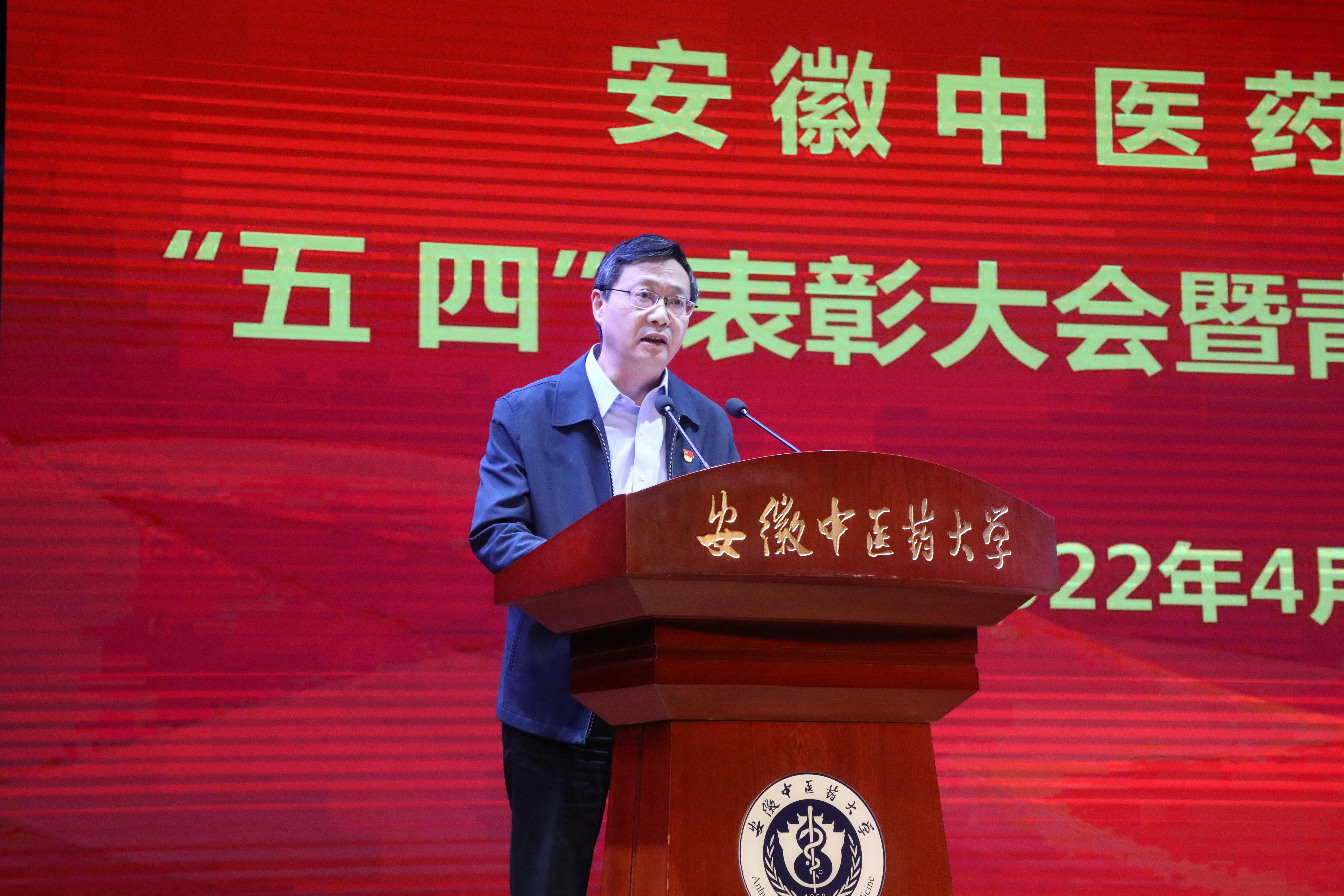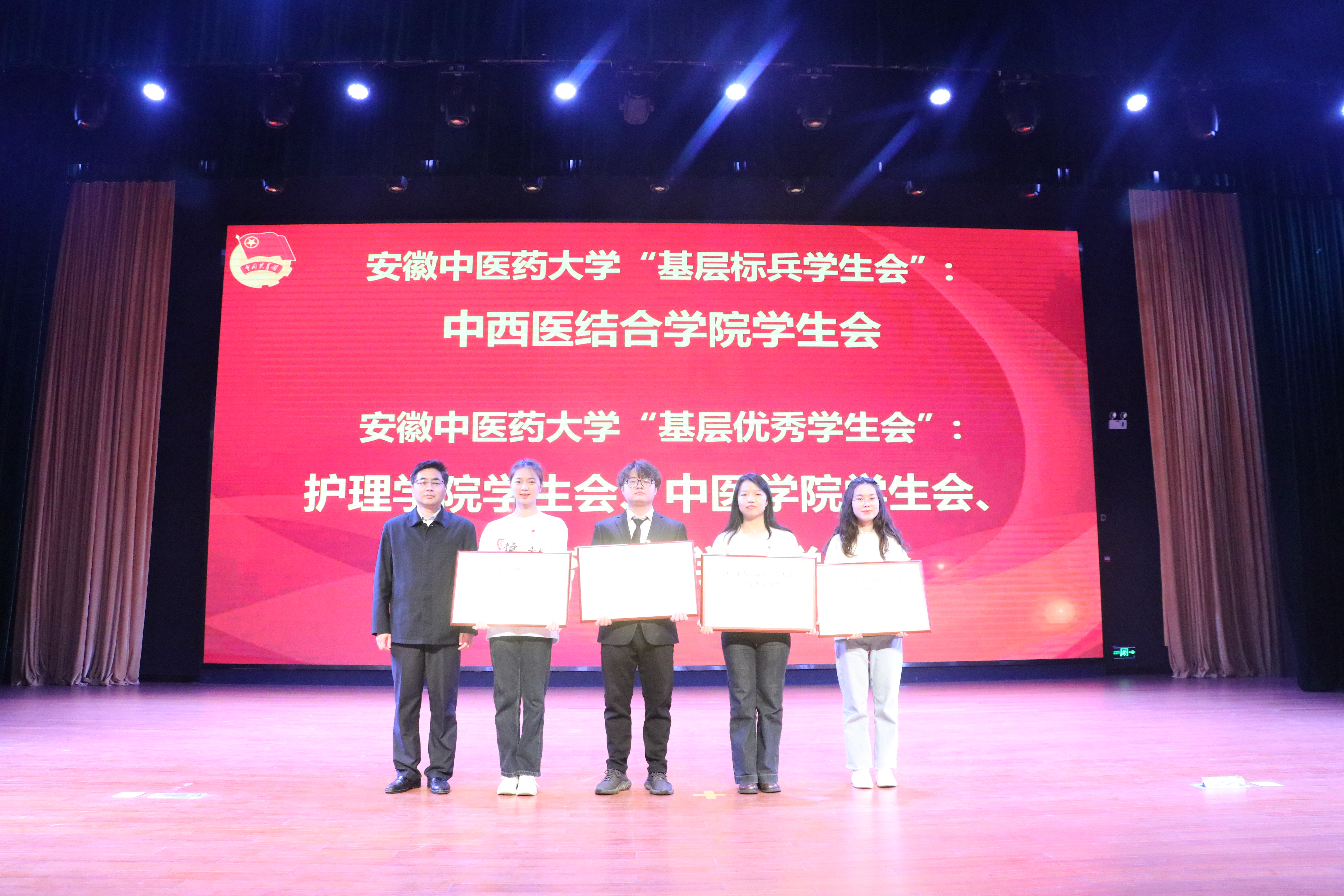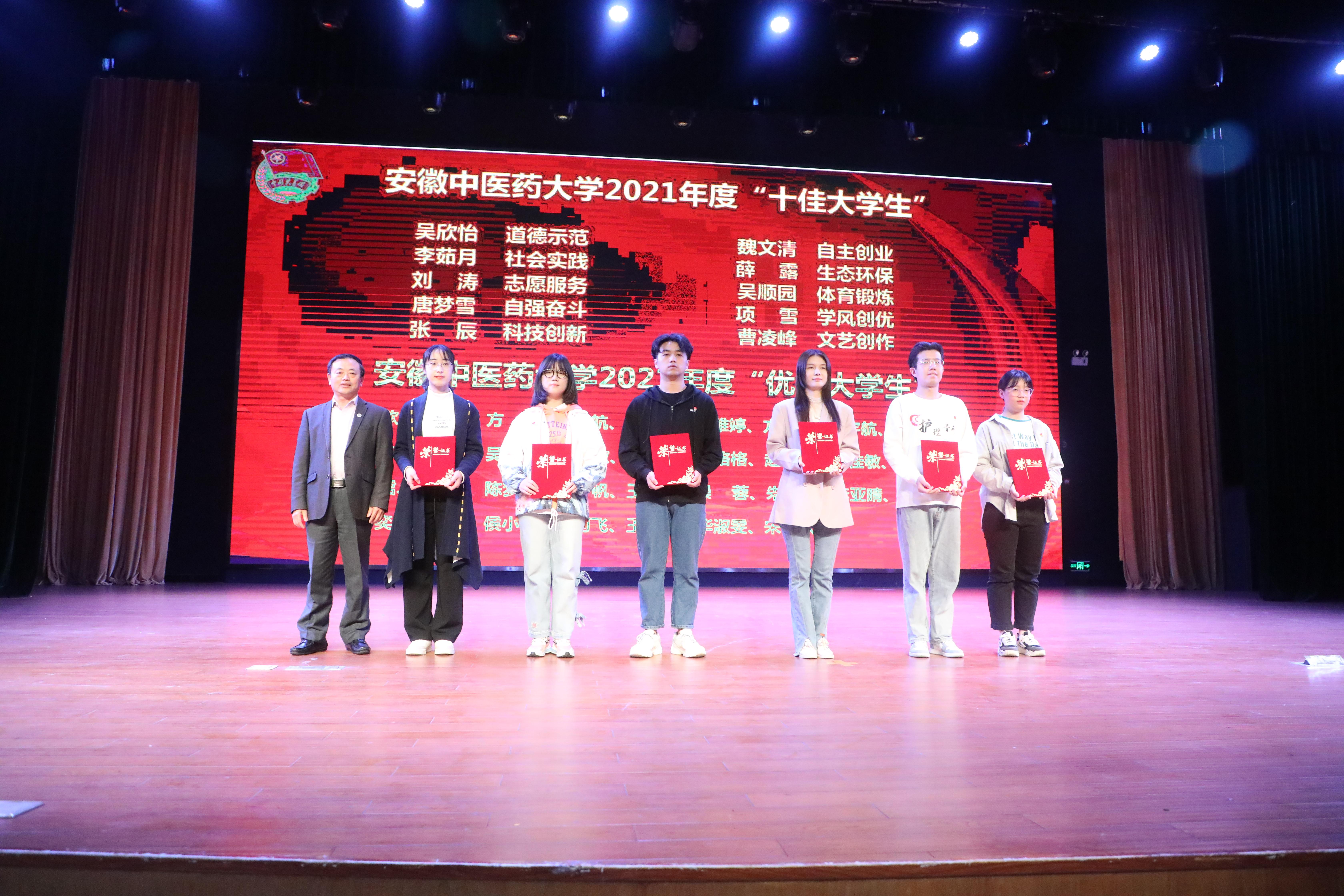 大会在雄壮的国歌声中开幕,表彰了2021年度安徽中医药大学“五四红旗团委”“基层优秀团委”“基层标兵学生会”“基层优秀学生会”“十佳大学生”“优秀大学生”“‘青’眼看振兴主题征文活动优秀组织奖”及2022年学校“挑战杯”大学生创业计划大赛优秀组织奖、3月“学雷锋志愿服务月”优秀项目和个人。与会嘉宾为获奖师生代表颁发了奖牌、证书。