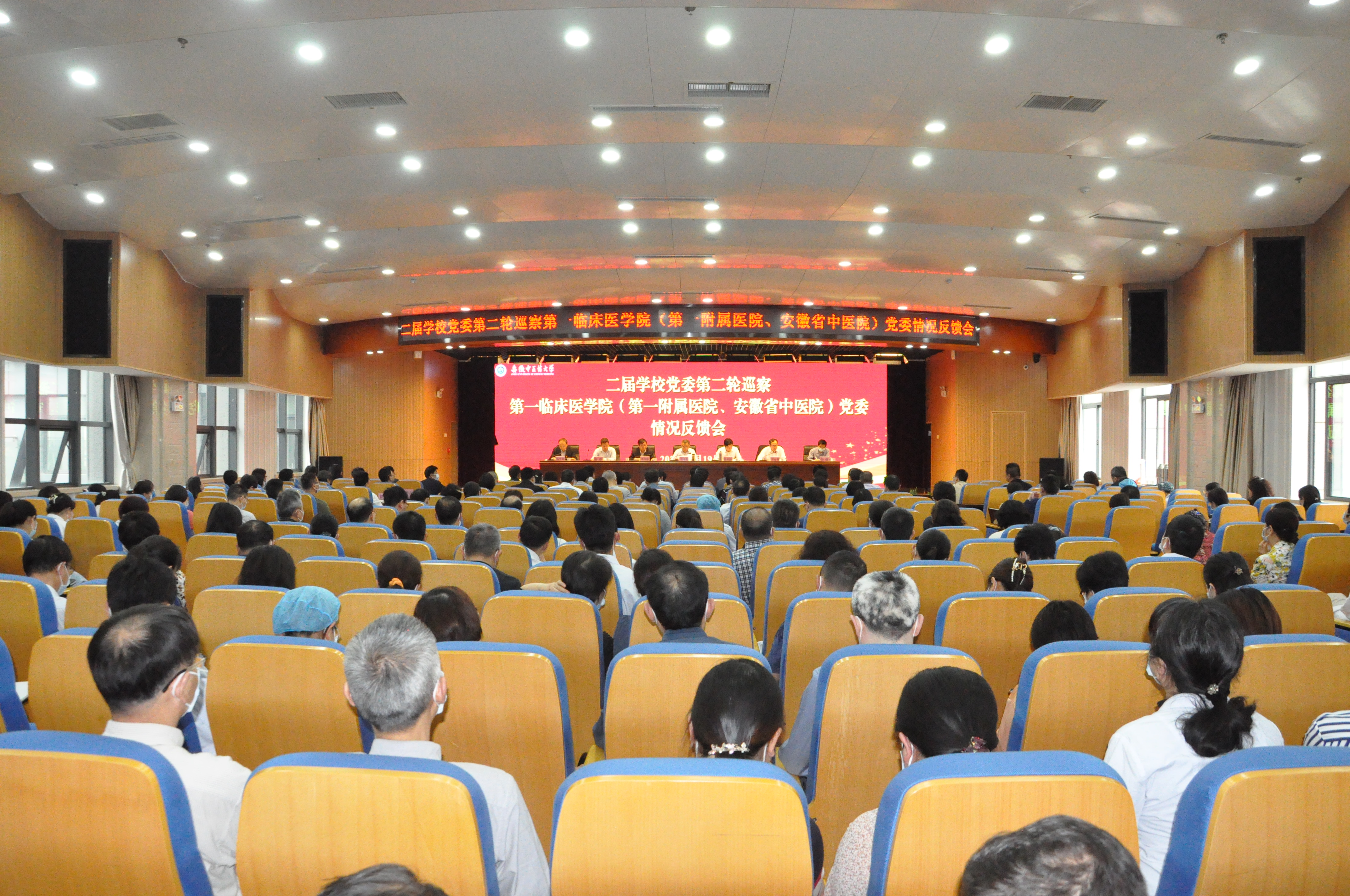 根据学校党委巡察工作统一部署,5月19日下午,二届学校党委第二轮巡察组巡察第一临床医学院(第一附属医院、安徽省中医院)党委情况反馈会在医院基地大楼科研楼学术报告厅召开。学校党委书记王先俊,党委副书记、校长彭代银,党委常委、副校长、科学院专职副院长李泽庚,党委常委、纪委书记、省监委驻学校监察专员、巡察组组长石金明出席会议,学校相关职能部门主要负责人、第二、三临床医学院班子成员参加会议。会议由彭代银主持。