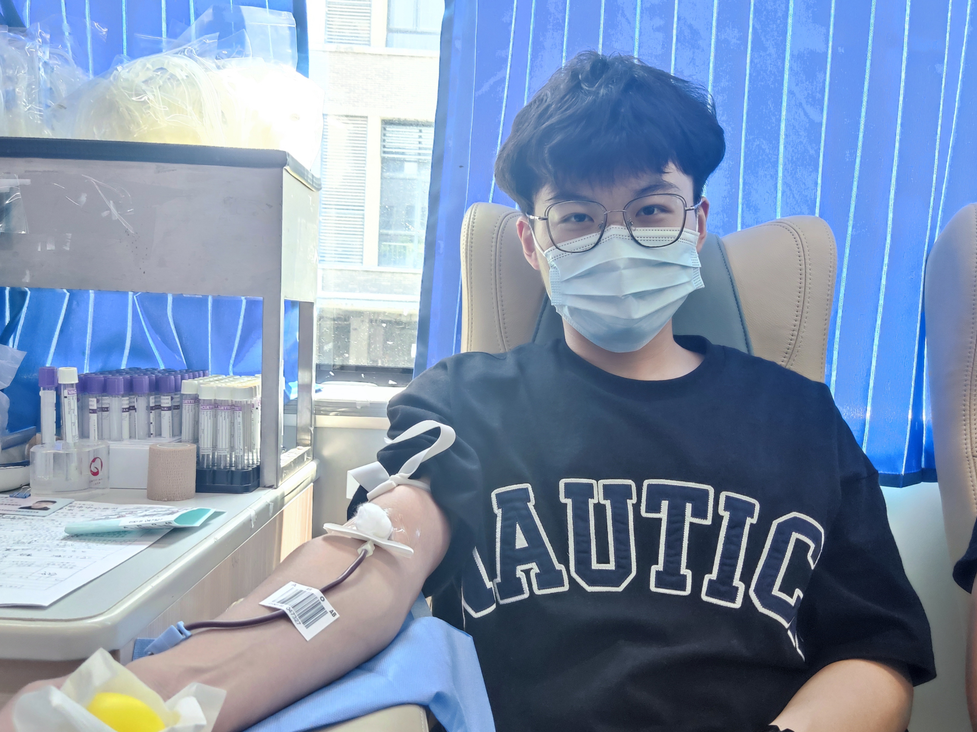 采血车上,同学们躺在采血椅上,勇敢地挽起袖管,献出自己的青春热血。“赠人玫瑰,手留余香”,来自医药信息工程学院的卢志豪同学说道:“今天是我第三次献血,希望可以通过献血来为社会和有需要人的人做贡献。”