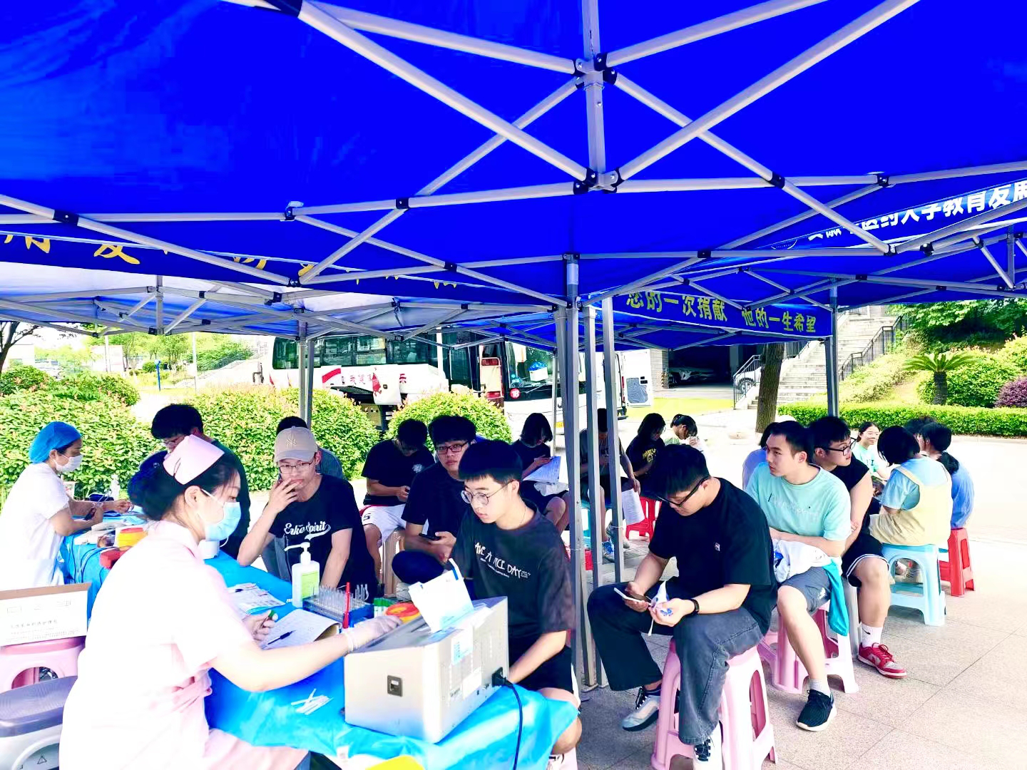 在报名区,志愿者详细讲解献血的注意事项、普及献血知识,准备食品、饮用水,为献血者提供营养,提醒不要空腹献血,防止中暑、晕厥等。在检验区,献血学生们自觉排队,在医务人员的指导下填写登记表、化验、采血,各项工作有条不紊地进行。