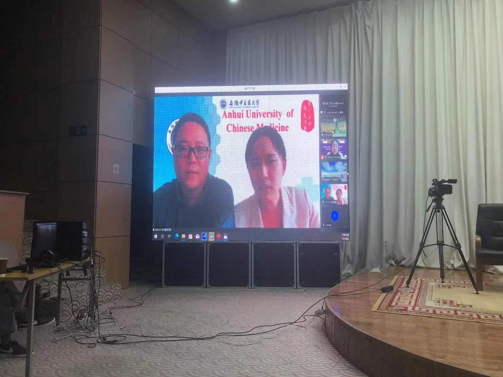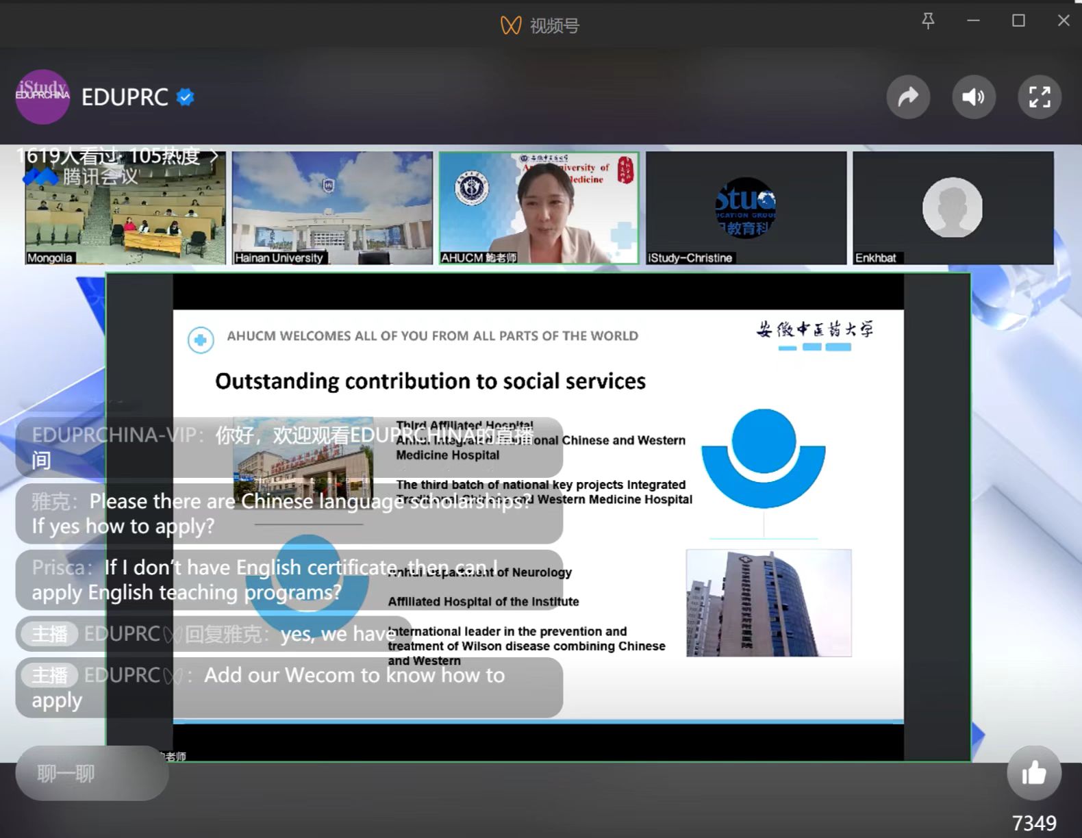 我校介绍环节,先播放了留学生招生视频,随后外事办的招生老师对安徽中医药大学的办学特色、招生项目、招生要求及合肥城市特有魅力展开介绍,并在最后问答环节就学生关心的奖学金等问题进行了重点阐述和耐心解答。