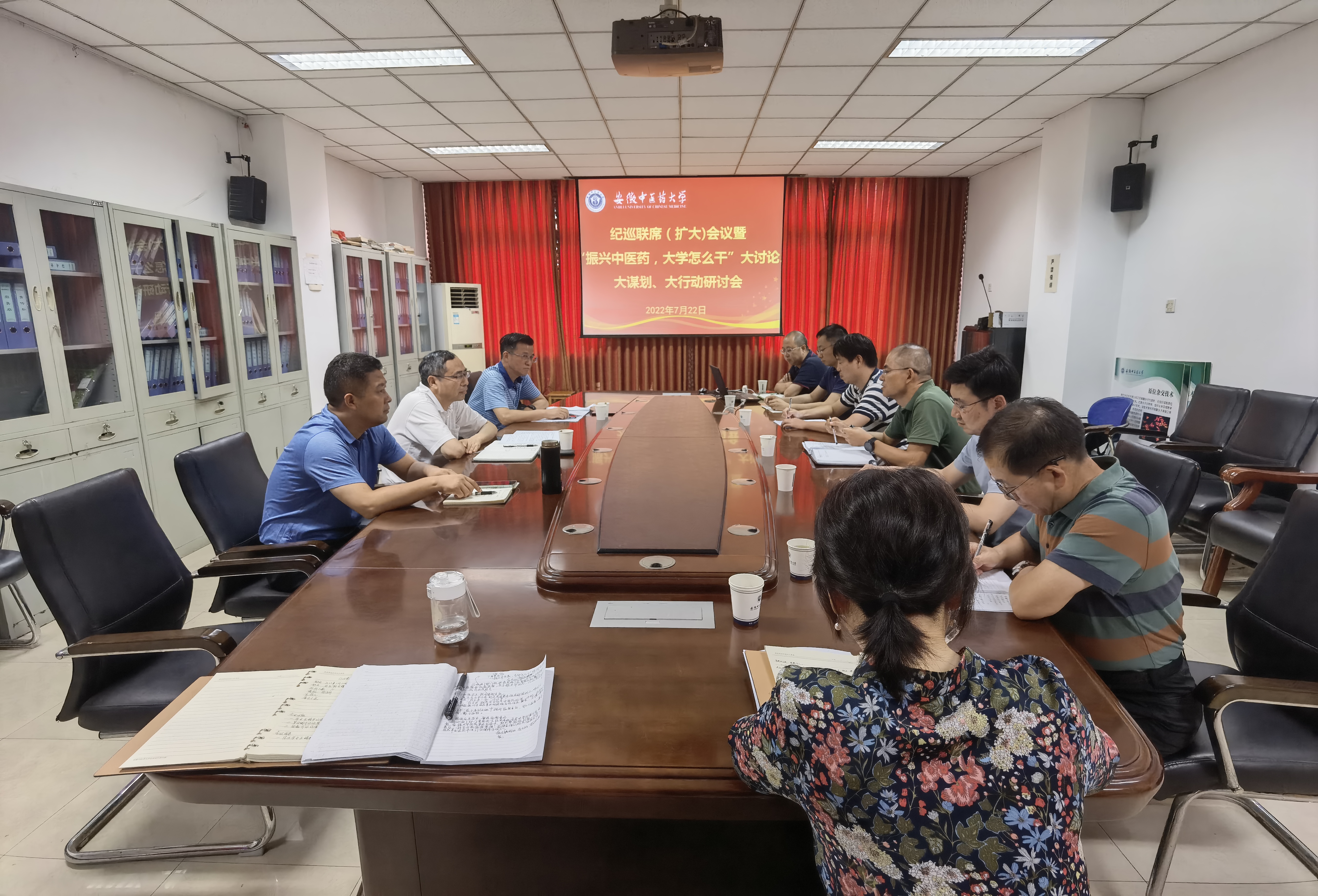 7月22日下午,学校党委常委、纪委书记、省监委驻学校监察专员石金明主持纪巡联席(扩大)会,会议主要围绕“振兴中医药,大学怎么干”开展专题研讨。学校纪委办、党委巡察办全体成员及三所直属附属医院纪委书记参加会议。