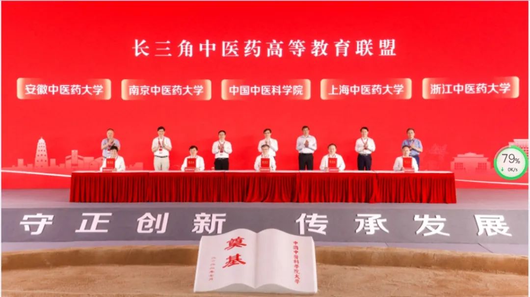 中国中医科学院联合上海中医药大学、南京中医药大学、浙江中医药大学、安徽中医药大学等高校,共同成立长三角中医药高等教育联盟,查德忠与相关高校领导共同登台签约。(来源:中国中医科学院)