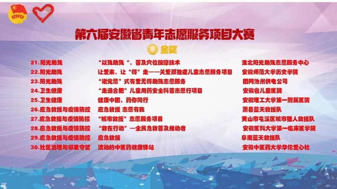 日前,团省委、省文明办、省民政厅、省水利厅、省文化和旅游厅、省卫生健康委、省退役军人事务厅、省总工会、省残联联合举办的第六届安徽省青年志愿服务项目大赛落下帷幕。我校荣获省级金奖1项、银奖2项、铜奖2项。