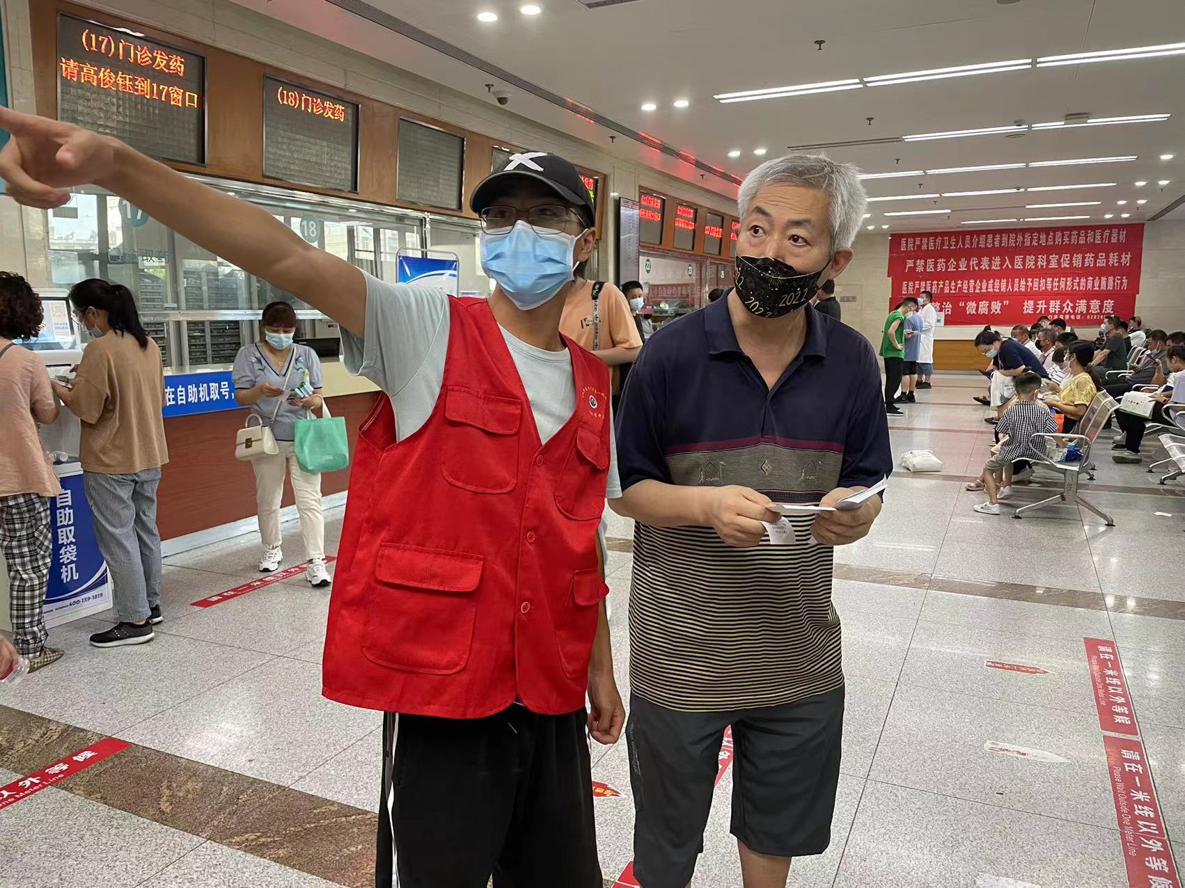 7月来,在医院门诊大厅、自助服务区、挂号、取药、候诊等各个区域,能看到一个个身穿红马甲的年轻身影,他们是医院职工子女志愿者,利用暑假时间、克服高温来医院开展爱心志愿服务。帮助患者就诊陪诊、协助自助取单、自助挂号等,并提供疫情防控宣传、维持秩序、宣传院内控烟等服务。针对老年人就诊不方便情况,医院专门成立老年人就诊服务志愿团队,协助老年人就医,提供温馨服务。