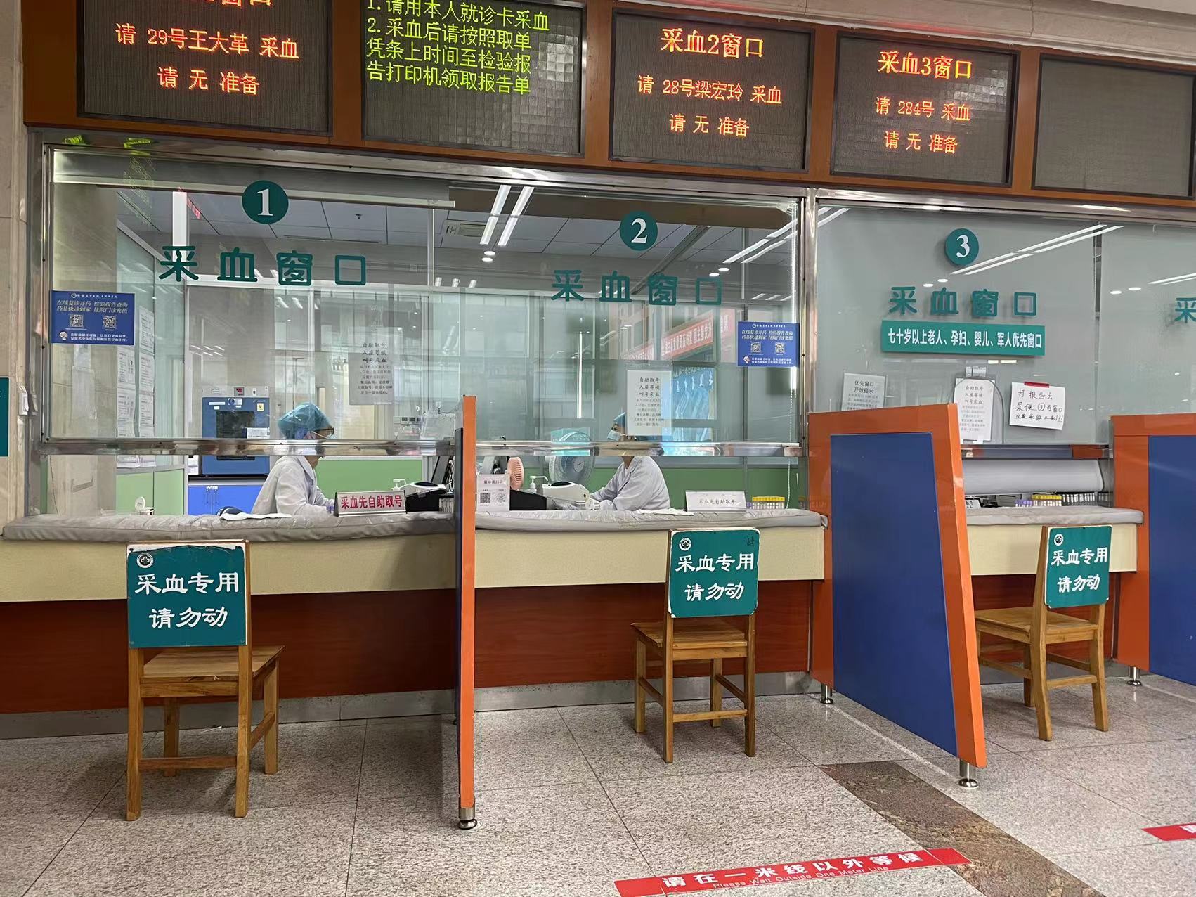 近期,门诊开展了一次“服务窗口全部测量”活动,对门急诊、住院的所有挂号、收费、取药、抽血、医保、医技、检验、报销、咨询等共计69个就诊窗口进行一次全部测量高度,保证所有窗口的高度均达到省卫健委要求的1.1米,部分抽血等特殊窗口配备固定的座椅。避免了患者“弯腰低头式”,提高了窗口高度,处处体现出门诊“以患者为中心”的服务理念。