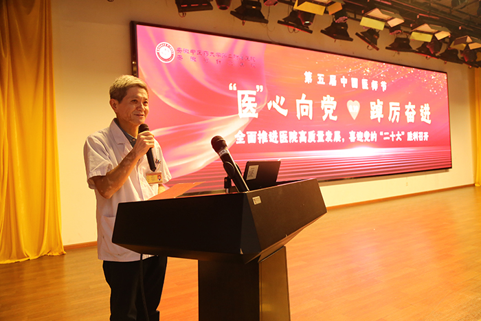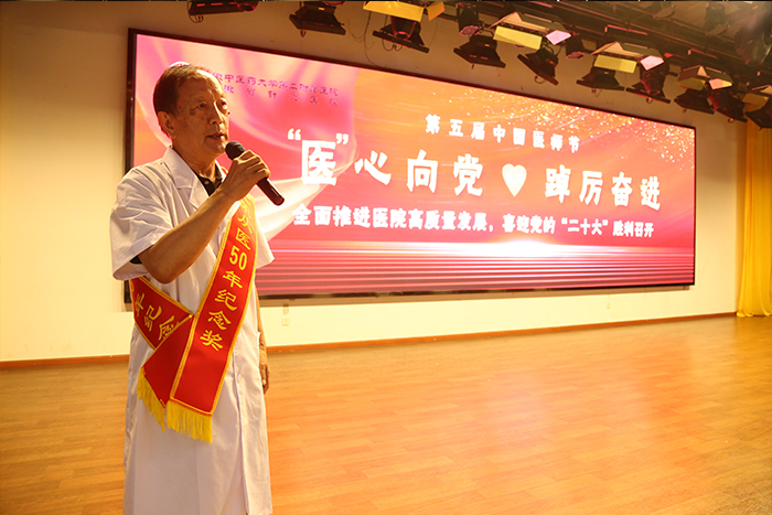 会上,全体医师重温《中国医师宣言》。雷黎为光荣从医50年医师颁发纪念奖章,老专家们发表了对年青医师的亲切寄语。李梦作医疗工作报告,对2021-2022年度的医疗工作进行了全面总结。郑为秀宣读2022年医师节表彰文件。领导班子为表彰集体及个人颁奖。援助柬埔寨抗疫医疗队及望江、岳西、郎溪县中医院驻点医师也连线送上祝福。