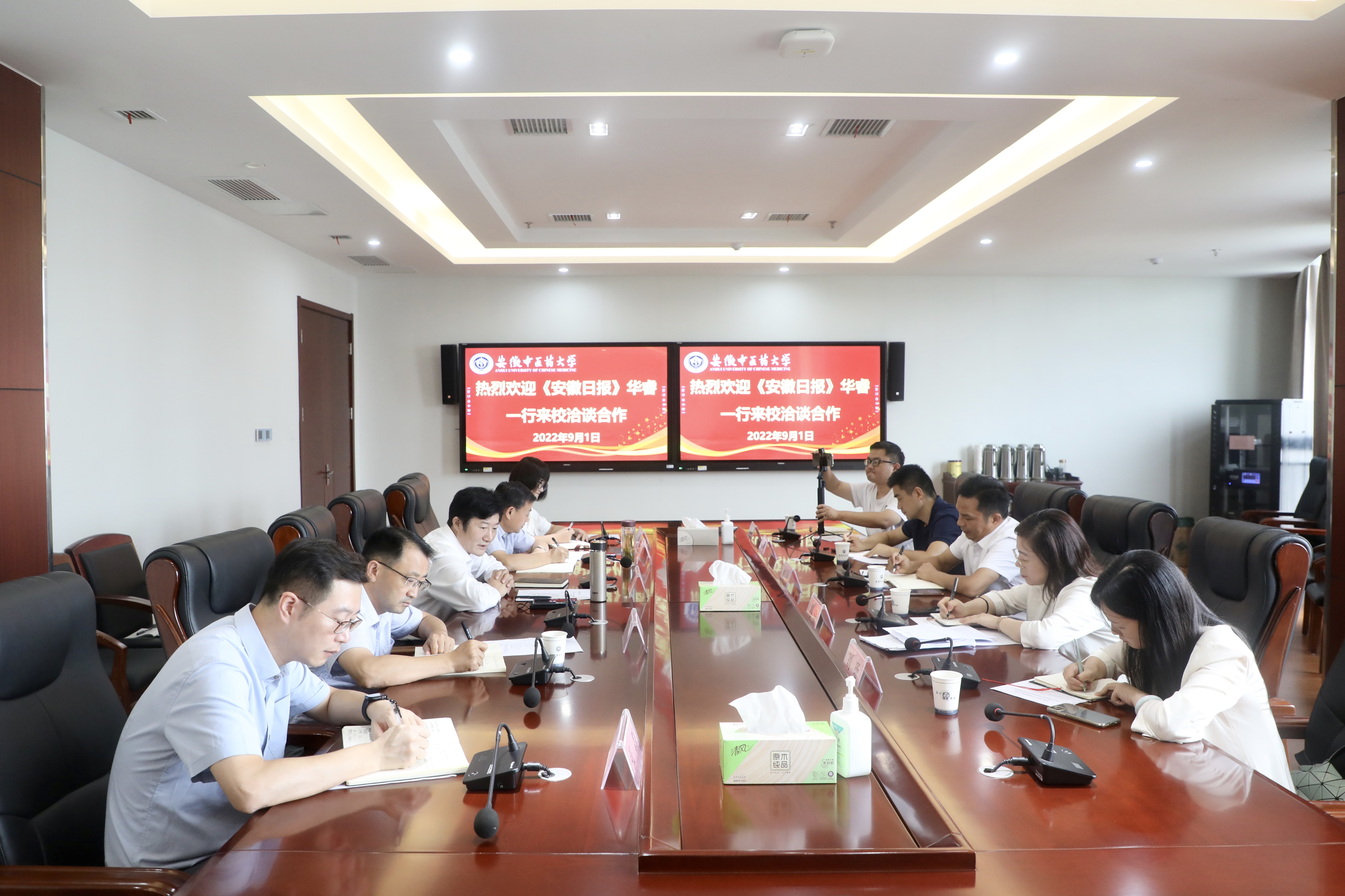 9月1日,为加强主流媒体对中医药的宣传,助力安徽省中医药振兴发展行动,《安徽日报》“医心医意”融媒体工作室负责人华睿一行5人来我校访问交流,就安徽中医药特色宣传洽谈合作。校党委副书记、校长彭代银,校党委常委、宣传部部长吴达武,马克思主义学院党总支书记黄学武出席座谈会,宣传部副部长及成员参加。座谈会由吴达武主持。