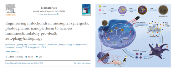 近日,我校药学院尹登科教授课题组在生物医学顶级期刊《Biomaterials》(中科院一区TOP,IF=15.304)发表题为“Engineering mitochondrial uncoupler synergistic photodynamic nanoplatform to harness immunostimulatory pro-death autophagy/mitophagy”(设计线粒体解偶联剂协同的光动力纳米平台以控制促死亡型自噬/线粒体自噬)的高水平研究论文(如下图)。2022级博士研究生孙全威为论文第一作者,杨晔教授和尹登科教授为通讯作者,安徽中医药大学为唯一作者单位。