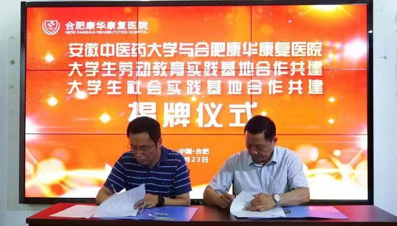 在热烈的掌声中,叶兰兰与吴同新为“安徽中医药大学(中西医结合学院)大学生社会实践基地、大学生劳动教育实践基地”揭牌,蔡标和郭毅签订安徽中医药大学(中西医结合学院)、合肥康华康复医院大学生社会实践基地、大学生劳动教育实践基地合作共建协议书。